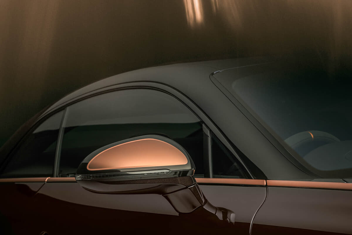 グロス仕上げのベルーガカラーがアッパーボディを引き締めている。さらに、フロントグリルやエンドレスボンネットラインのブライトウェア、ミラーキャップ、ロワーボディキット、22インチのトリトンホイールには、サテンローズゴールドのアクセントをプラス。これらのホイールには、ブラックキャリパーを備えた迫力のカーボンセラミックブレーキが組み合わされている。