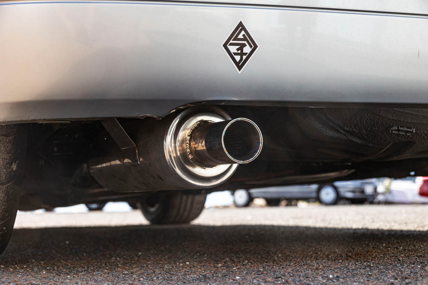 吸排気系にもしっかりと手が入っていて、岐阜のイタフラ専門店「レッドポイント」製のエアクリーナーは「クリオ カップ」と同位置に取り付けされ、吸気の適正化に貢献している。排気系はφ60mmのワンオフマフラーをmotoGPなどで活躍している職人に依頼し、溶接の美しさを見せるようにタイコ部が見えるようにこだわって設計してもらい、車検に適合するようにインナーサイレンサーも装着されている。