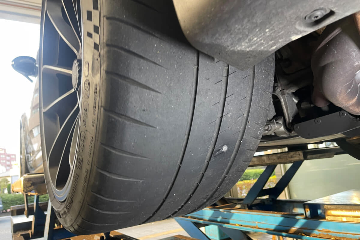 なんと、左後輪タイヤには太い皿ネジが刺さっておりました。もっとも車両購入時点のタイヤの状態は6分山かつ2017年製タイヤと、変えるべきタイミングには来ていた。これも「GT3に乗るならちゃんとタイヤを変えなさい」という天の思し召しか。