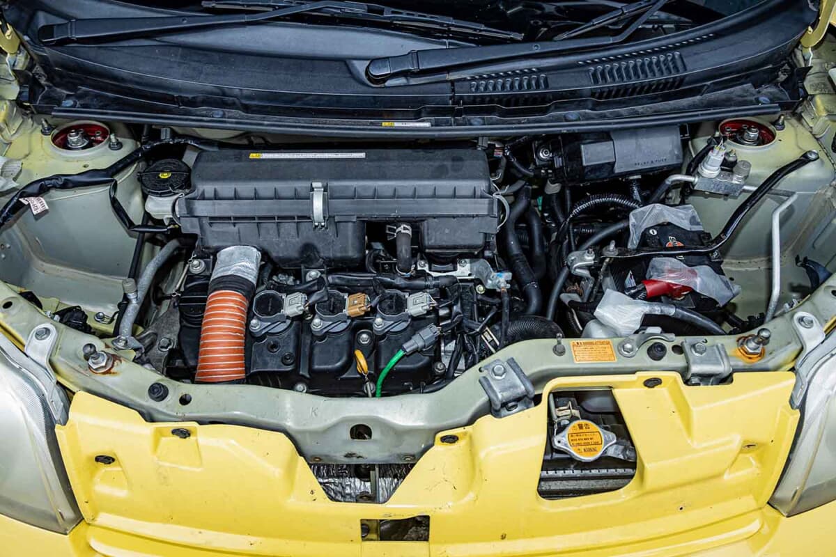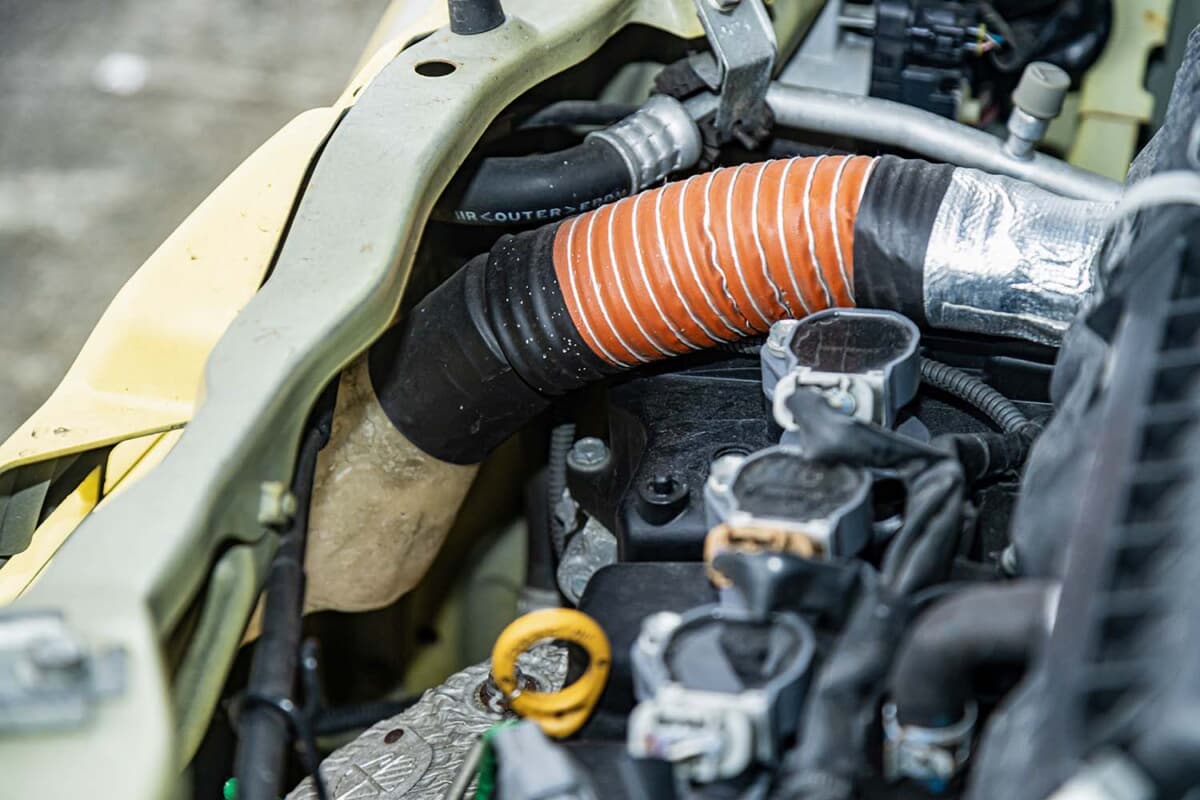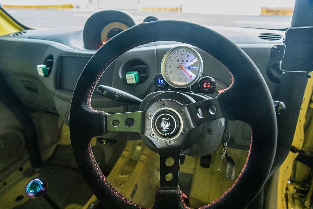 レギュレーションで極端な改造はできないが、その代わりこだわったのは徹底的な軽量化だ。ボンネットとリアゲートはハートビートのFRP製に交換し、不要なパーツはすべて取り外し、バッテリーも軽量タイプに交換している。さらにエアコンのコンデンサーも1列おきに削る徹底ぶり。