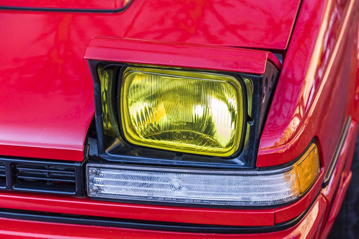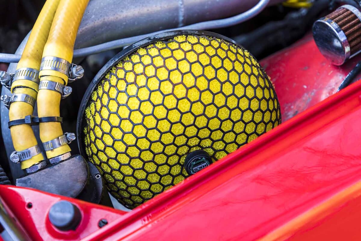 エンジンルームはヘッドカバーやエアクリーナーをはじめ、細かなホース類までイエローで統一。ヘッドライトもあえてイエローレンズを採用し、細部にまでこだわりが感じられる。