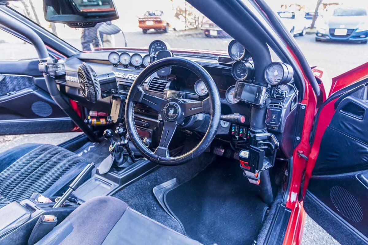 フロントにはS12型シルビア後期型の純正リップスポイラーを装着し、サイドステップは北米仕様のみで採用された純正品。リアウイングも輸出仕様の2ピース純正品とマニアックなパーツチョイスが光る。内装は本来ベージュだが、“サノッチS12”さんの好みに合わせてブラック系の内装一式を入手し、総入れ替え。さらにロールケージを装着し、メーターも後期型に交換しているという。