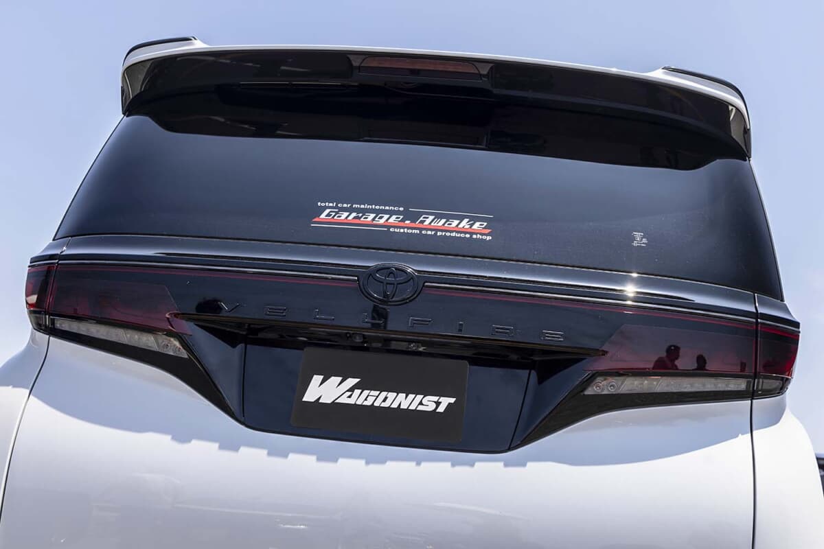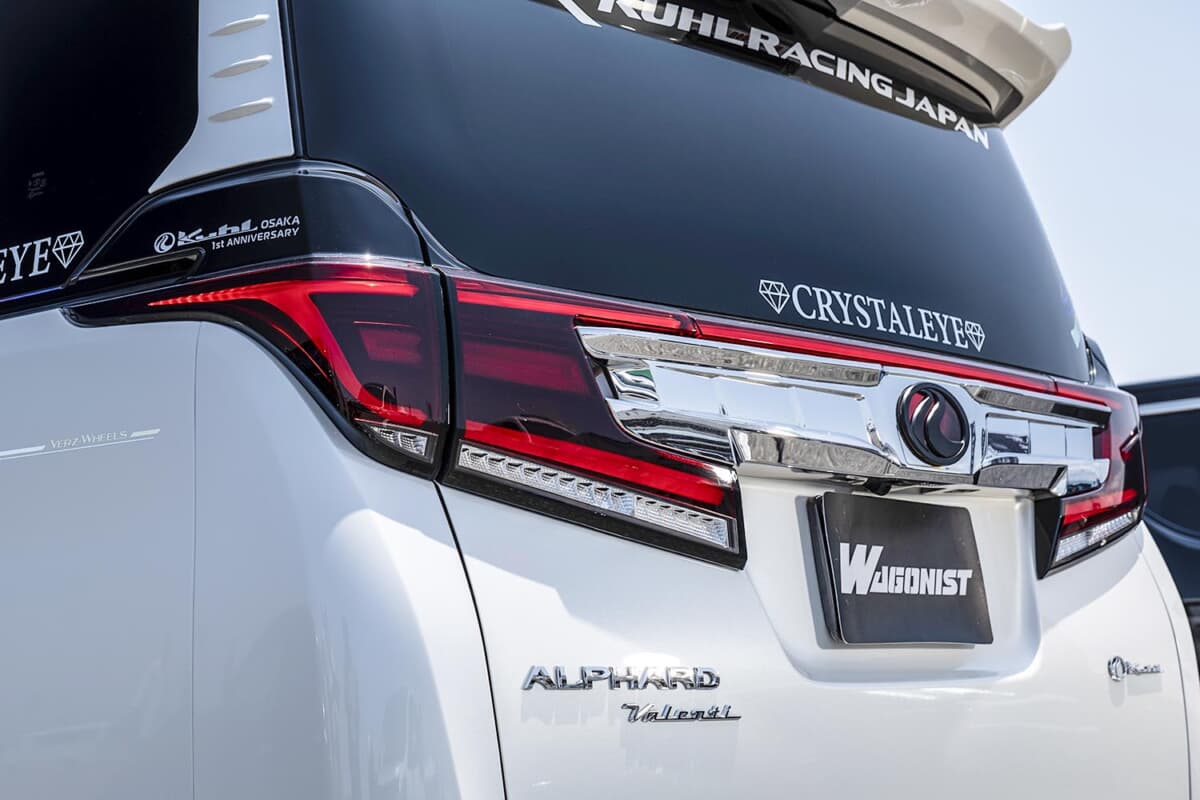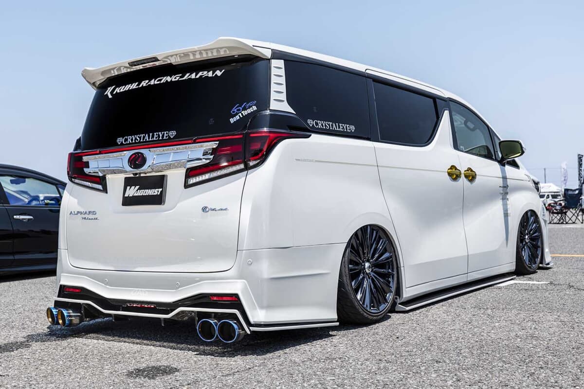 “Kouji”さんのトヨタ40系「ヴェルファイア」。リム被りを実現する低さとブレーキキットを装着した足元がとにかく魅力的で、すでに40系でここまで仕上げてきている。足まわりは低さを求めてカズサスのエアサスを投入し、Jラインとカズサスのアーム類、底上げマフラー、フェンダーのツメ加工やインナー加工などで究極のローフォルムを実現した。