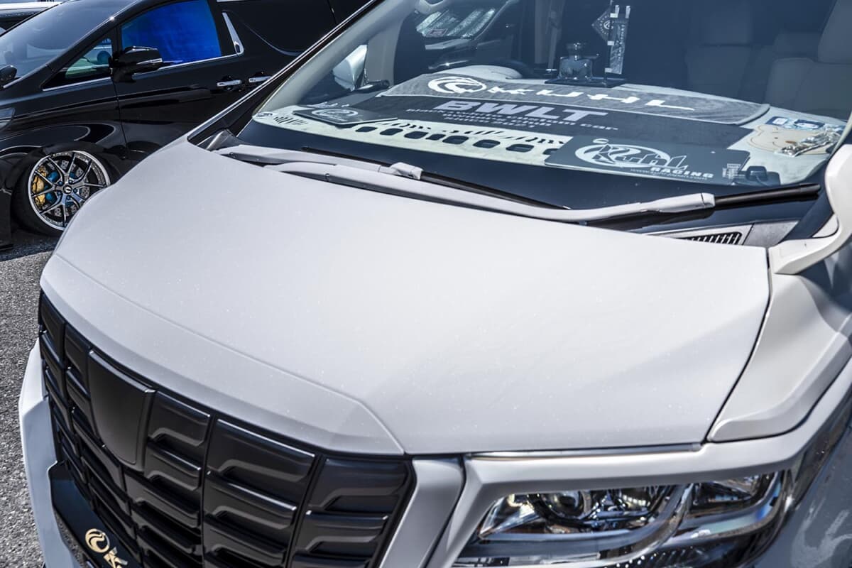 ボンネットとワイパーアーム、ドアミラーはマットホワイトでラッピングすることで、テカリを抑えたフロントマスクを実現。大技&小技を取り入れながら、全体のバランスも重視し、オンリーワンのアルファードを目指してカスタムを続けている。