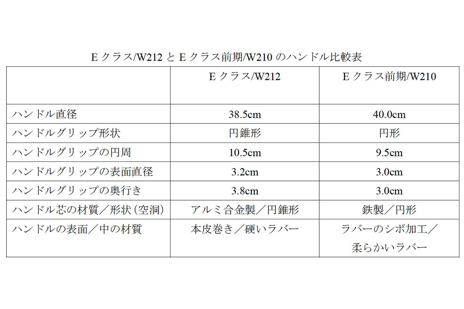 一方、Eクラス/W212のステアリングの芯は、円錐形状のアルミ合金を抱き合わせており空洞で軽量化を図っています。握りの部分は本皮を硬いラバークッション部分に貼り合わせ、しかも縫い合わせてあります。また、グリップの円周は円錐形状で、10.5cmとEクラス前期/W210よりも1cm大きくなっています。グリップの奥行きは3.8cmとかなり大きくなっています。
