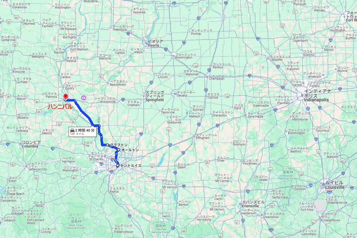 • セントルイスからミシシッピ川左岸を北上、トム・ソーヤーの故郷、ミズーリ州ハンニバルを目指す