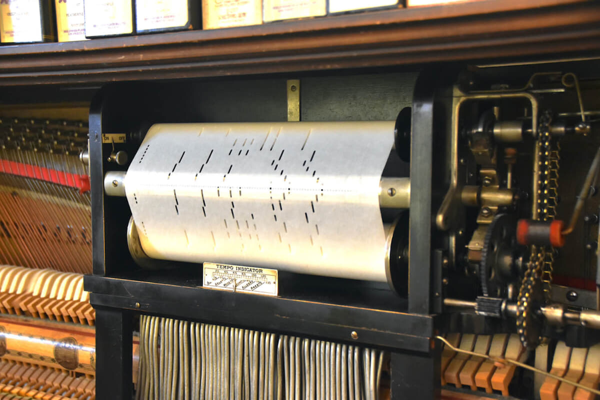 • スコット・ジョプリン博物館のリナさん。足踏みで空気を送ると自動ピアノが曲を演奏する。ピアノの上に並ぶ箱が「楽譜」
