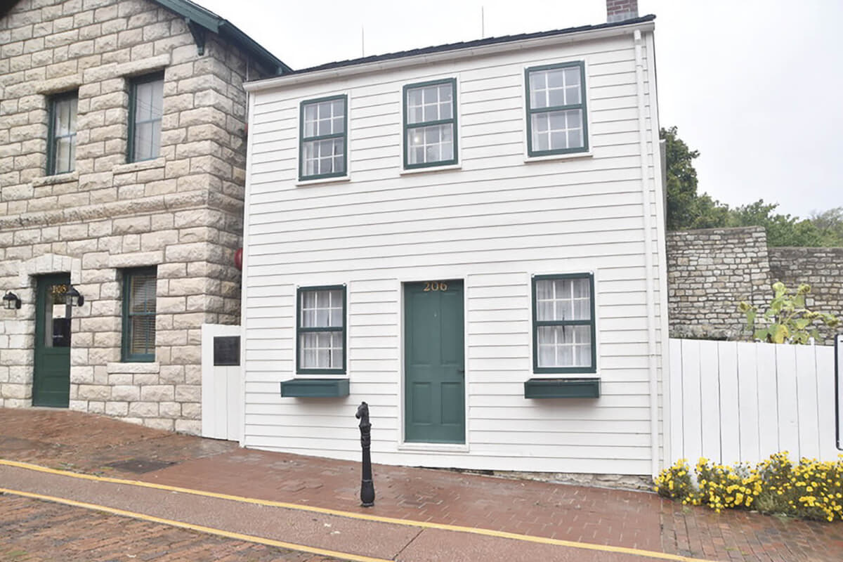 • トムの家。右側の白いフェンスが物語に登場する有名なフェンス