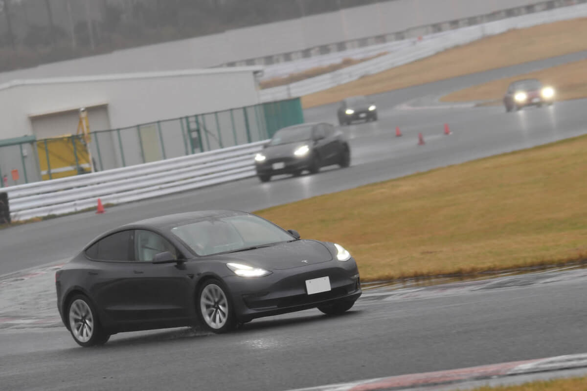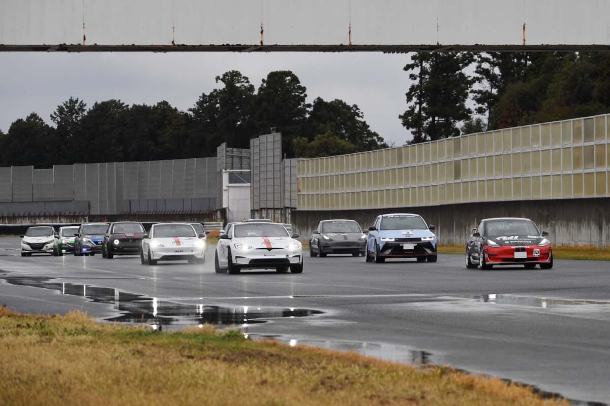 EVでサーキットを走ると電費が減ってしまい数周も持たないと言われることもありますが、実際はそれほどでもありません。JEVRAが移動式の充電施設を持ち込んでいるためいざとなれば現場での充電も可能という安心感もあり、今回は30台の申し込みがあり参加車は非常に多い印象を受けました。