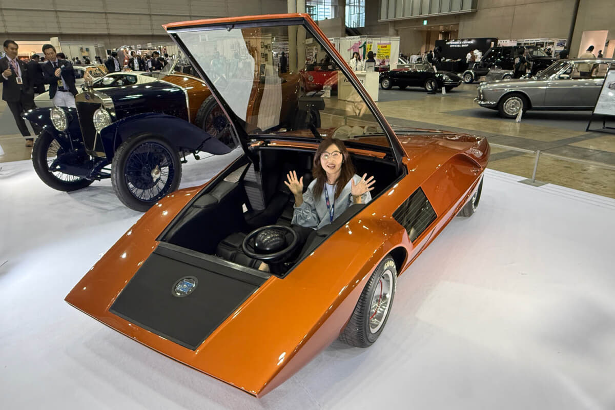 ジウジアーロさま関連以外のクルマも豪華! 世界に1台しかないランチア「ストラトス・ゼロ」も登場。このクルマはオートモビルカウンシルの2週間前にCCCJ(クラシック・カー・クラブ・オブ・ジャパン)さまが主催したイベントに海外から出品されたのだけど、急遽延長して参加したらしいわっ。とにかくデザイン力が素晴らしくて、フロント部分が前に開いて乗り込むのよ。特別にわたくし、乗り込ませていただいたわ〜。狭いし、乗り込みにくいし、運転もしにくそうだけど……わくわくする〜〜〜!