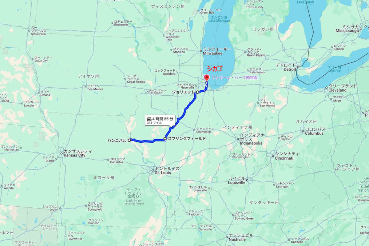 • ミズーリ州ハンニバルからスプリングフィールド、ジョリエットを経由してシカゴへ
