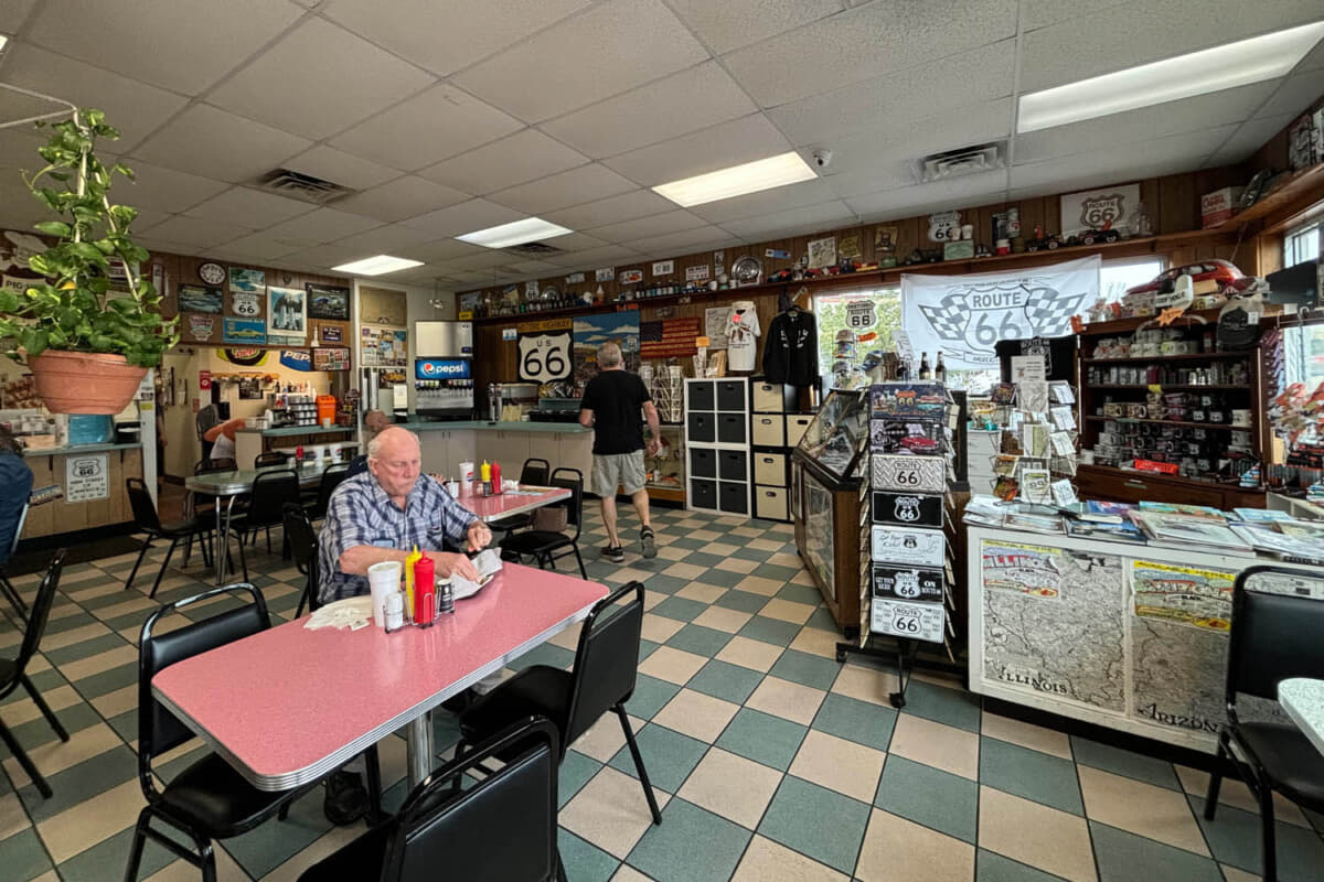 お目当ては「コージー・ドライブイン」。ソーセージがダンスを踊るサインが目印で、店内にはルート66関連のデコレーションが賑やかに施されている。お客さんも「66」を目当てにした人が多いようだ。名物のアメリカンドッグとコーヒーでひと息つく。