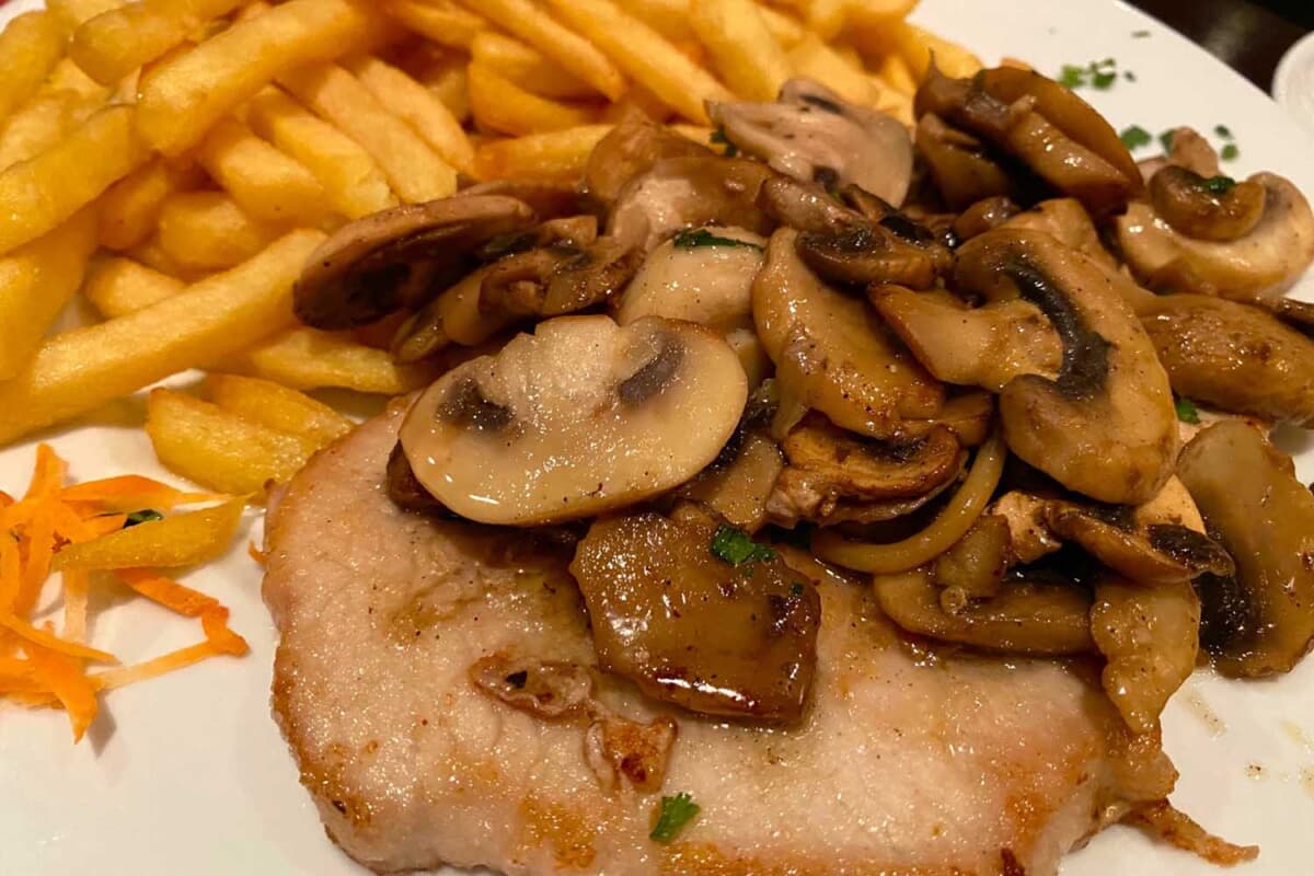 • ピステンクラウゼのポークソテー。ガーリックマッシュルーム添え