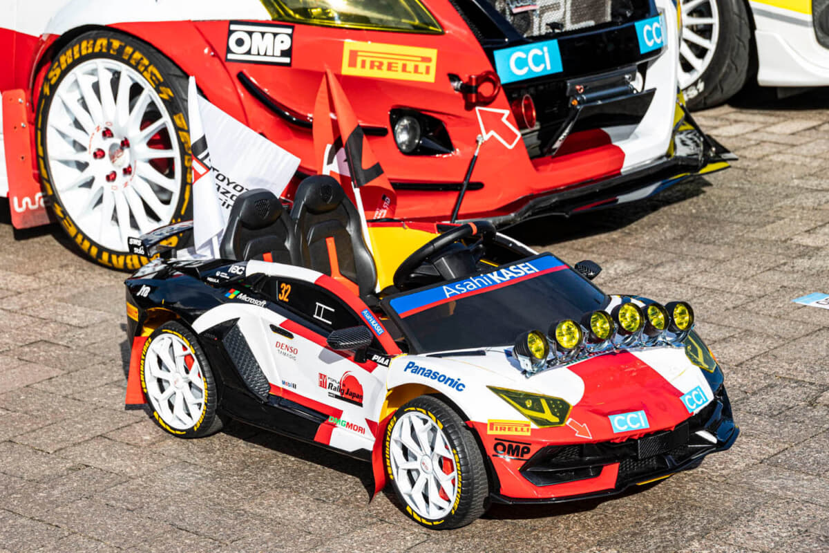 お子さんが乗る用のキッズカーはランボルギーニ「アヴェンタドール」だが、こちらもラリーカーイメージにラッピング。ホイールも塗り直してOZのステッカーを貼り、OZのホイールのように見せている。家族揃ってWRCのイメージで楽しめるようにDIYを駆使して作られているのだ。