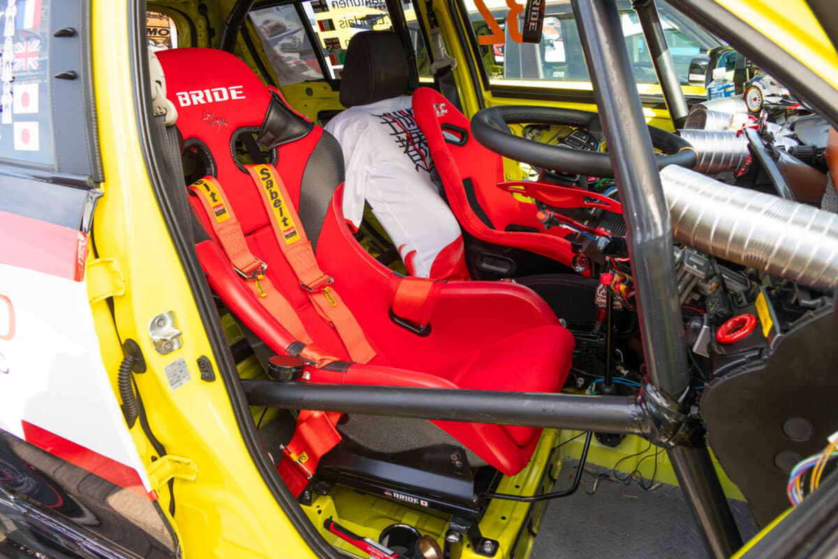 車内はラリーカーのイメージにするためにドンガラ状態で、内装はもろもろ外されているが、子ども用シートを使って3名乗車も可能。家族3人でお出かけできるのだ。