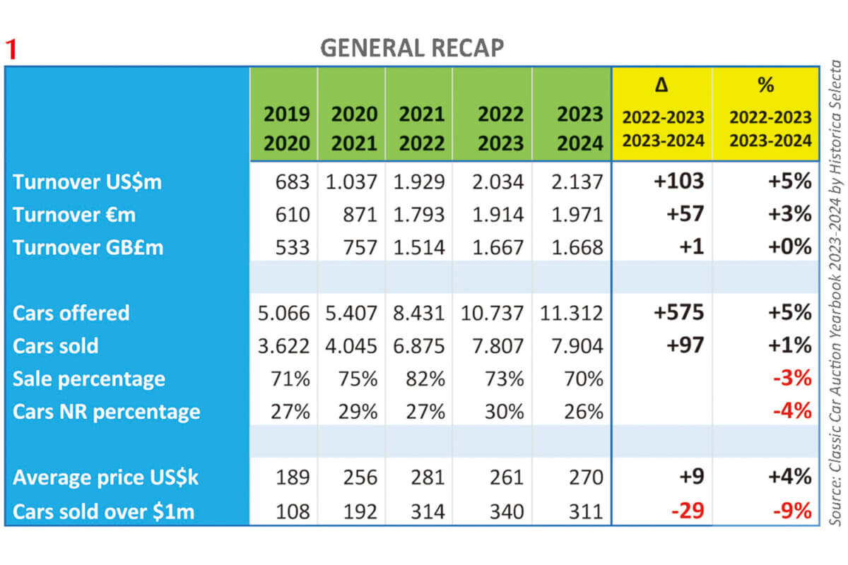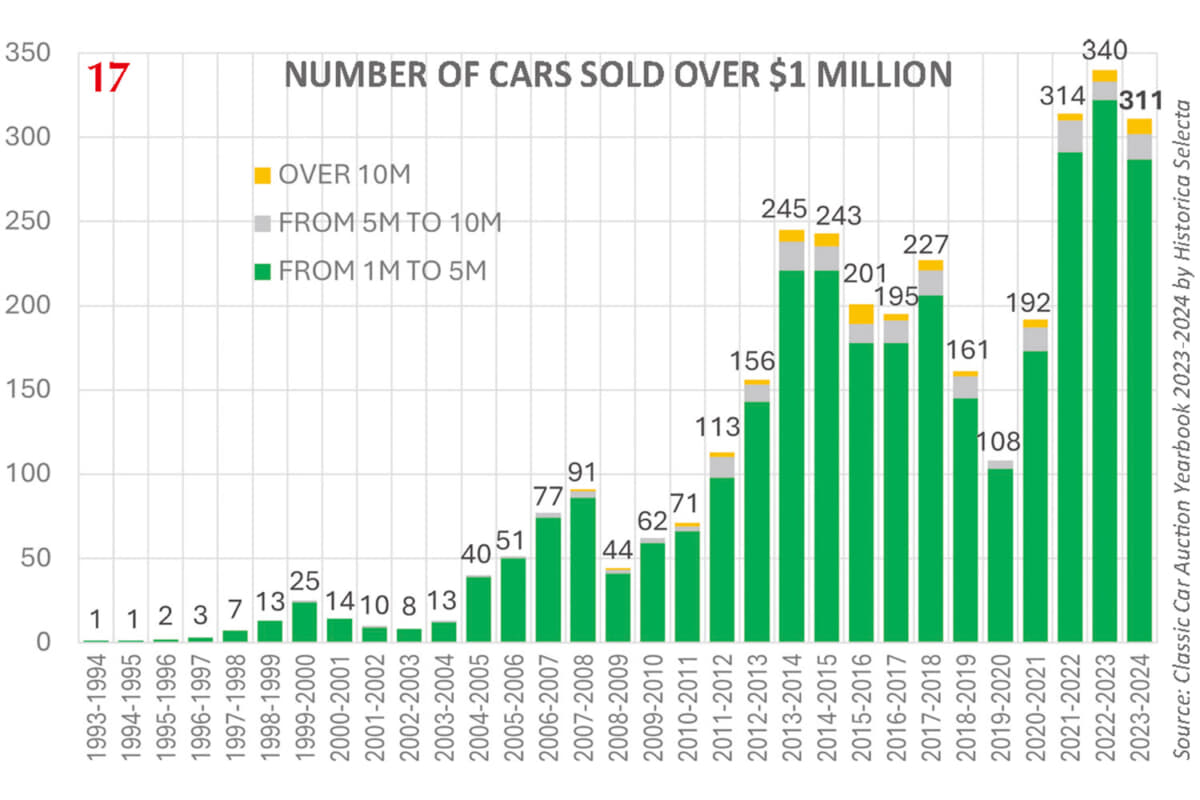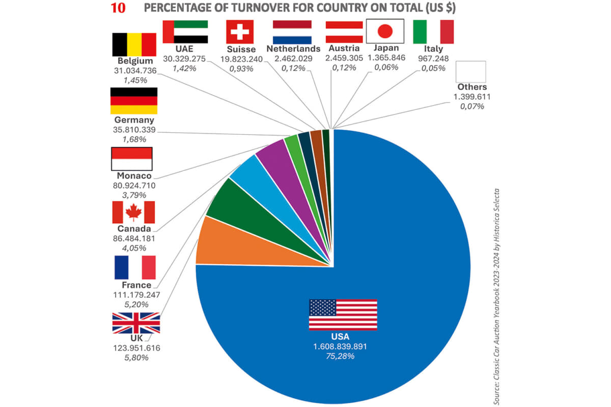 2024年発表されたCar Auction Year Book(29版、2023年9月1日〜2024年8月31日までのオークション結果)は世界で行われた101のオークション会場に出品した1万1312台の車両に関しての分析が掲載されている。落札された数は7904台で約70%。総売上金額が21億3700万ドルと、日本円にして3100億円以上になる。なんとその75.28%がアメリカ市場での売上という。2番目はイギリスで5.80%。アメリカがダントツだ。因みに日本は0.06%。また、そのなかで落札価格が100万ドル(約1億4600万円以上)以上の車両は311台に達しているとのこと。