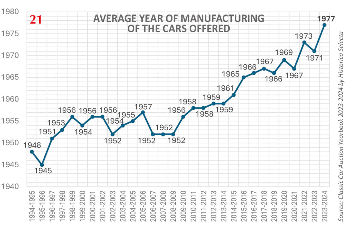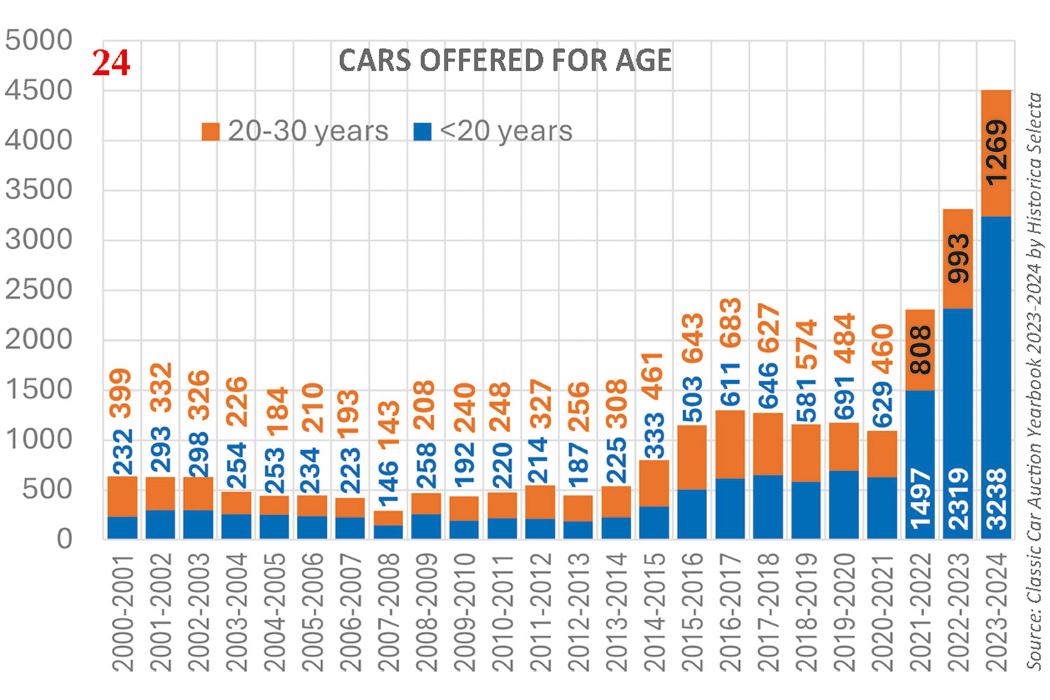 またここ最近の統計で顕著に表れているのが若者の台頭という。クラシックカーのコレクターの層も徐々に入れ替わり、若年層も増えてきた。それに伴って落札される車種も若返っている。2000年以降のクルマが36%となっている。時代の流れとともに通常のライブオークションからインターネットも使用する様になり、徐々に高額な車両もインターネットで落札される様になって来たようだ。これも若年層が増えてきた要因もあるだろう。