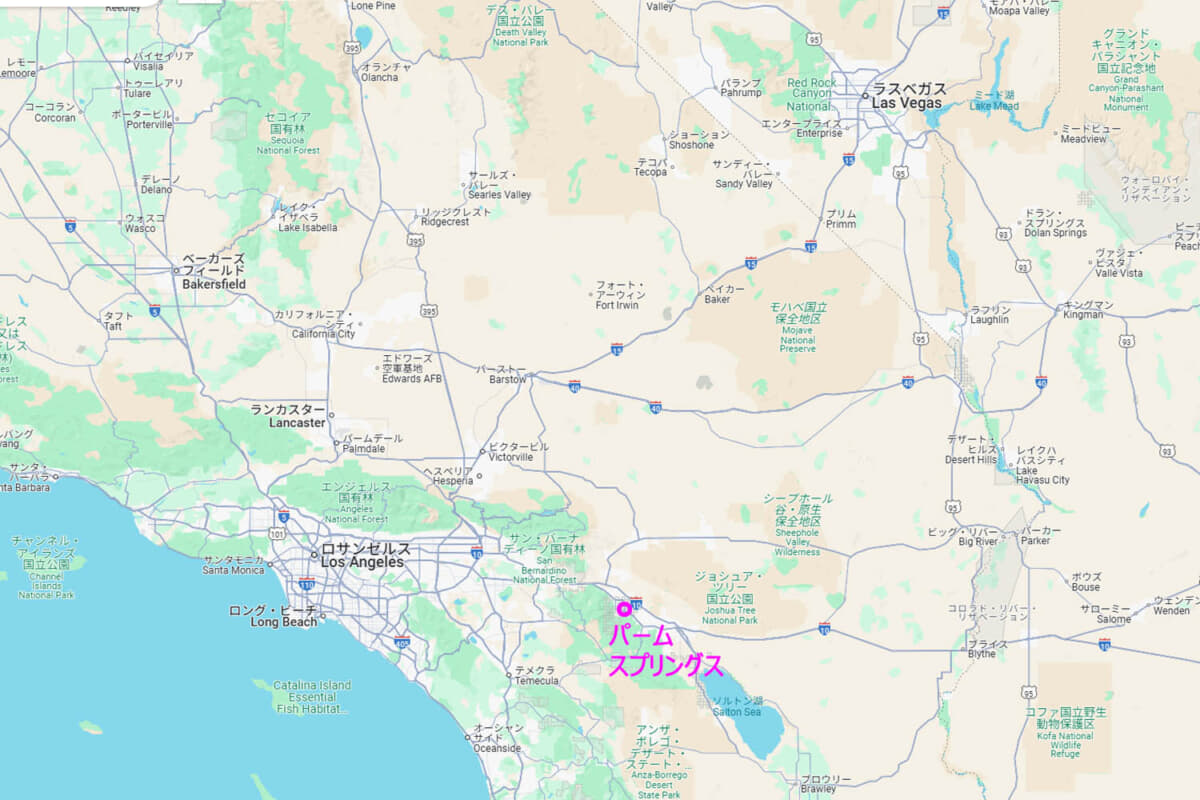 この旅の大雑把なルートとしては、カリフォルニアとアリゾナの州境にあるルート66の町「ニードルス」を目指しつつ、その前に絶対に寄り道したい大自然スポット「ジョシュアツリー国立公園」へ。初日はLAXを午後に出発なので、さらに手前にある「パームスプリングス」の町で1泊するというプランだ。