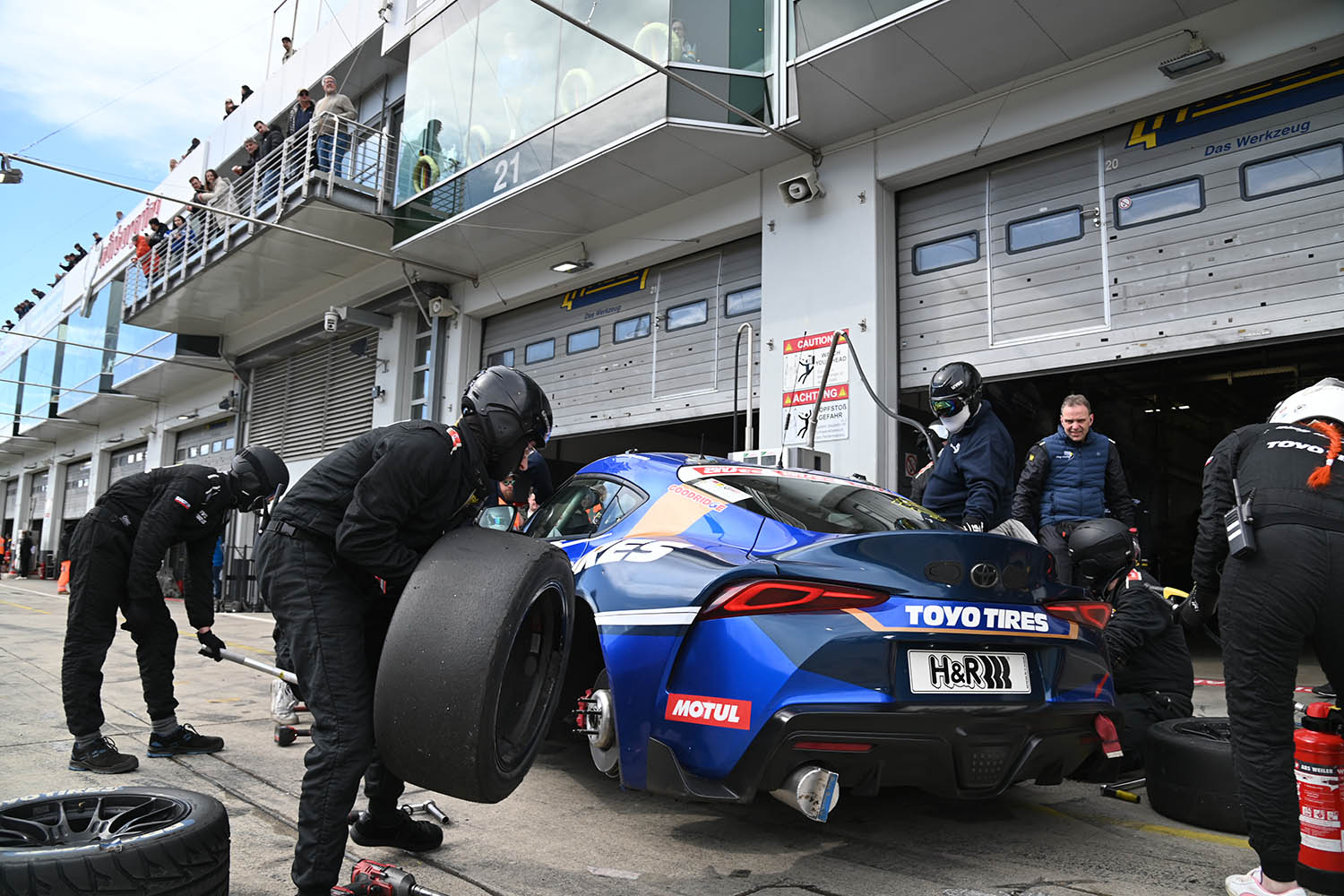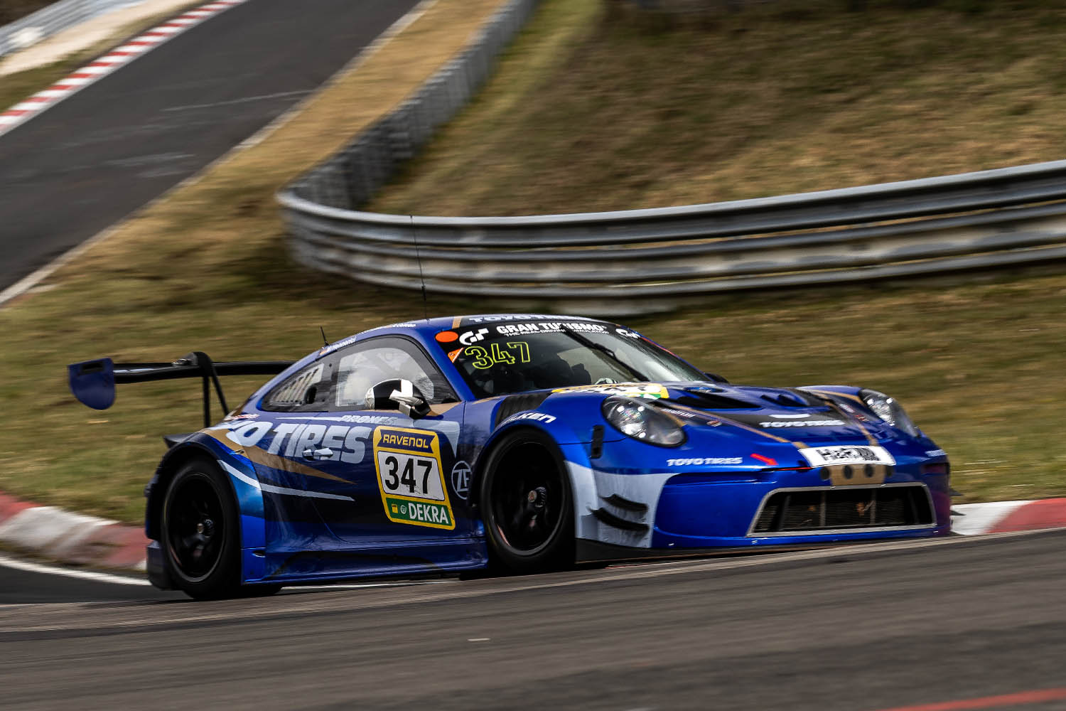 昨シーズンにトヨタGazooレーシングのスープラGT4でNLSを既に経験している山中/小高コンビだが、ニュルブルクリンクでコンビを組むのも地元ドイツのチームに加入するのも初めての事で、彼らにとっては新天地での武者修行のはじまりの日で、各セクションを担うチームクルーらと積極的にコミュニケーションを図る事を心掛けていた姿が非常に印象的だった。一方で、ベテラントリオの#347のポルシェを駆る3名のドライバーは、既に昨年のNLS後半3戦へ試験的に導入されていたとはいえ、様々な条件が昨年とは異なるだけに、TOYO TIRESのチーフエンジニアを筆頭に開発担当者らとタイヤのコンディションを綿密に確認しながら周回を重ねた。