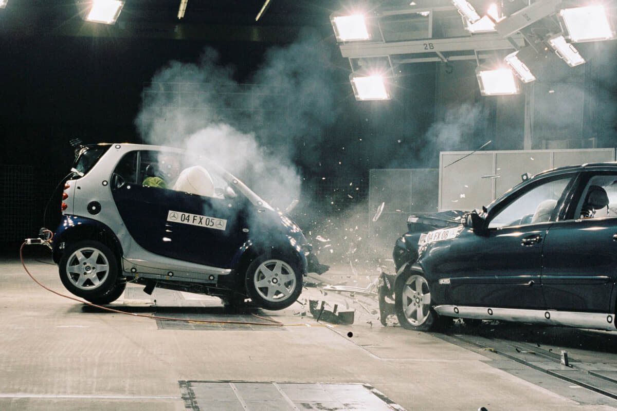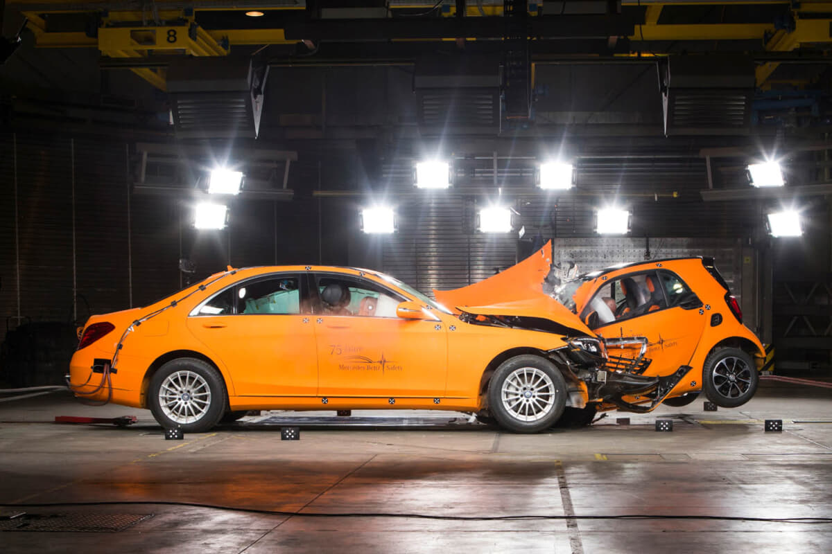 • コンパティビリティの哲学を世界で初めて市販車に本格的に導入したのが、1995年に発表したEクラス/W210。つまり、自らの衝撃吸収能力をより高めることで生まれたクラッシャブルゾーンの余裕を相手方の車両と分かち合うということ。写真はスマート フォーツーとSクラスの衝突テスト(2014年)