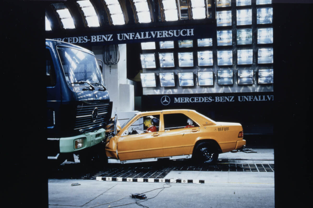 • コンパティビリティの哲学を世界で初めて市販車に本格的に導入したのが、1995年に発表したEクラス/W210。つまり、自らの衝撃吸収能力をより高めることで生まれたクラッシャブルゾーンの余裕を相手方の車両と分かち合うということ。写真はEクラス/W201と大型トラックとの衝突テスト