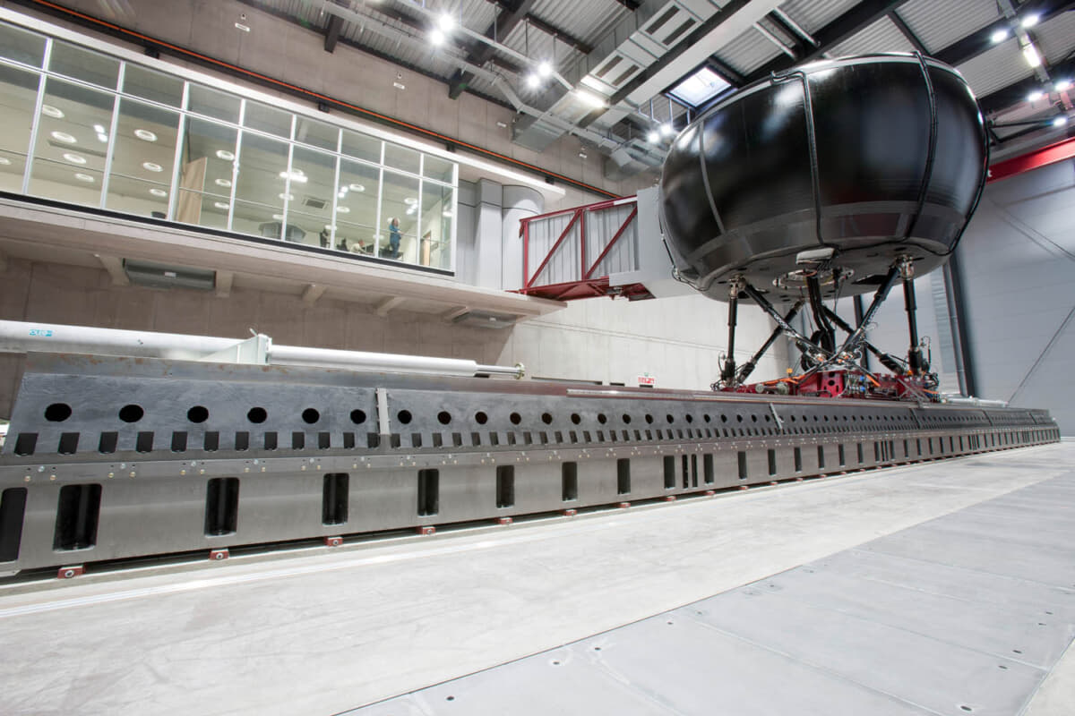 • このムービングベースシミュレーターは360度スクリーン、高速電気システム、テストセットアップに応じて横方向または縦方向の動きに対応する12mの長さのレールを備え、シミュレーターセルは6つの可動支柱に取り付けられている