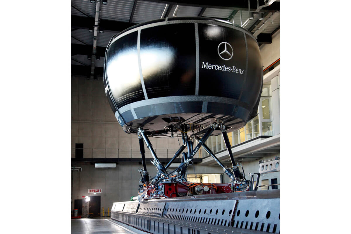 その後、2010年10月、ジンデルフィンゲンのメルセデス・ベンツ・テクノロジー・センター(MTC)でムービングベースの新ドライビング・シミュレーターが正式にオープンしました。このムービングベースシミュレーターは360度スクリーン、高速電気システム、テストセットアップに応じて横方向または縦方向の動きに対応する12mの長さのレールを備え、シミュレーターセルは6つの可動支柱に取り付けられています。