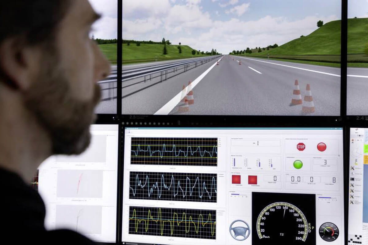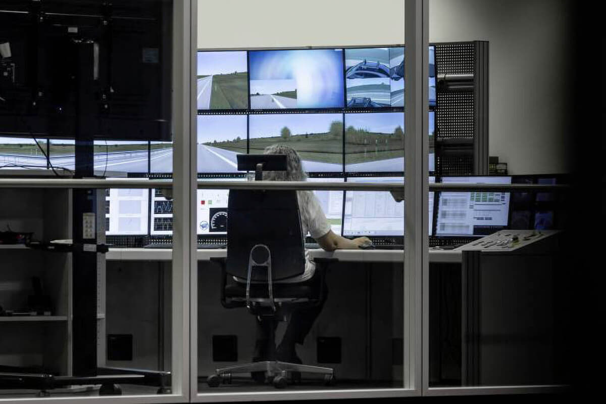 車両制御は、データラインによってドライビング・シミュレーターのコンピュター制御にリンクされています。シングルチャンネルまたはマルチチャンネルのプロジェクションと走行音を伝えるサウンドシステムのおかげで、非常にリアルにドライバーは仮想世界に没頭し、実際の道路交通のように行動できます。