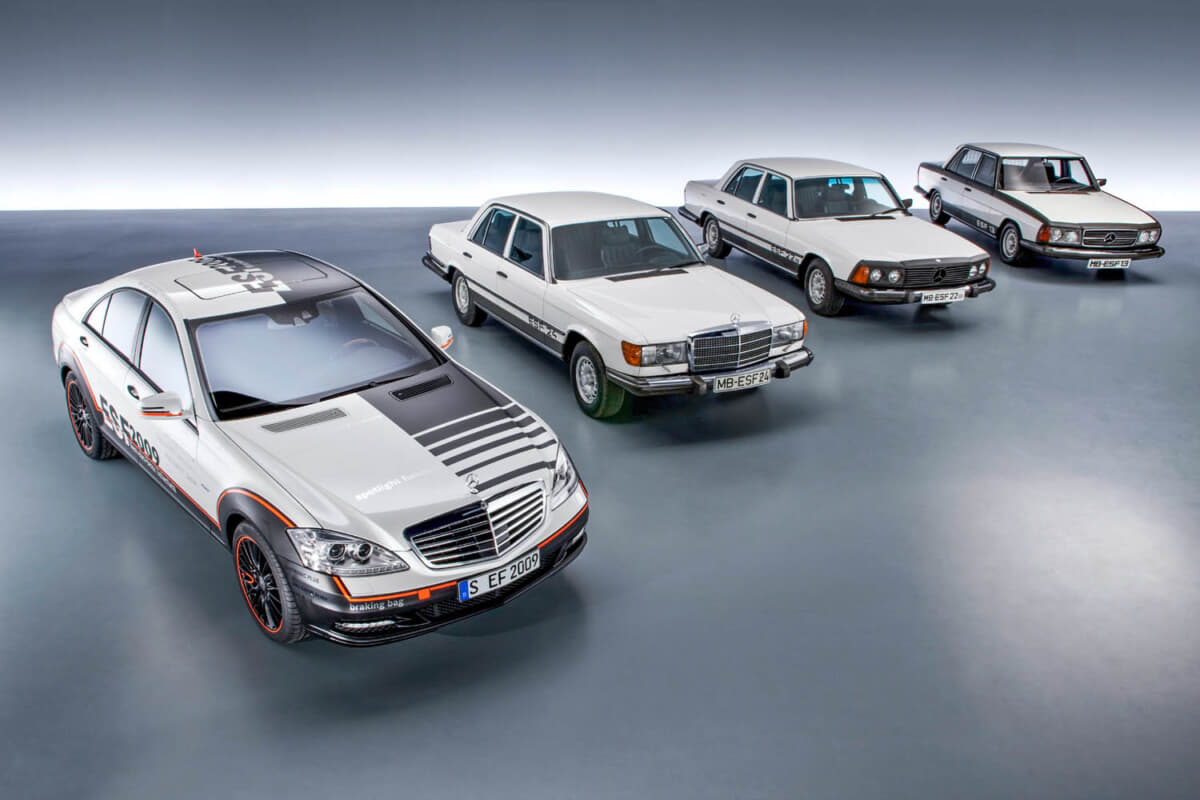 • 歴代のESF。右からESF 13(1972年)、ESF 22a(1973年)、ESF 24(1974年)、ESF 2009(2009年)。とくにESF 22aは明らかに当時のSクラス/W116(280S/350SE)をベースにしたもので、外観は一変しているが、ボディ・コンストラクションの上ではわずかな補強と、前後に安全バンパーを備えるぐらいの改良に留まる