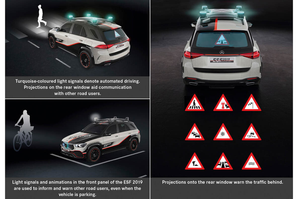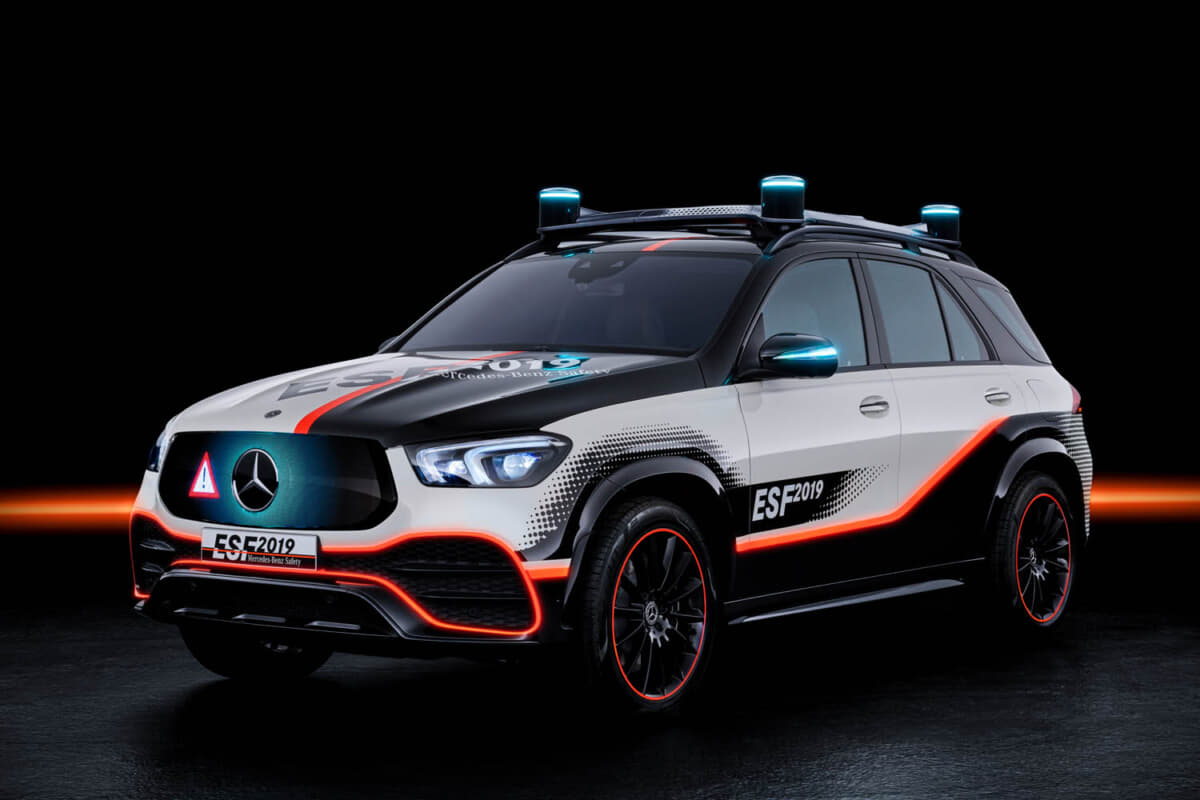 • 第5世代の安全実験車であるESF 2019はGLEがベース。自動運転システムの採用はもちろん、開発中のさまざまな安全システムが搭載されている