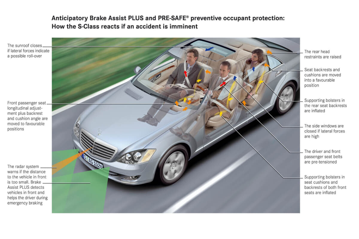 プレセーフの特徴は、フロントバンパーに取り付けられた短距離レーダーからの情報を活用し、回避できない衝突が起こる直前に前席のシートベルトを巻き上げて、ドライバーと助手席の乗員は衝突時に身体が前方に潜り込まなくなるため、頭と首にかかる衝撃を軽減する。この実験でのメルセデス・ベンツのエンジニアの記録によると、頭部にかかる衝撃が約30%、頸部にかかる衝撃が約40%減少している。このプレセーフ機能は事故発生の約0.2秒前に起動するため、事実上、予測乗員保護の最終手段となる。