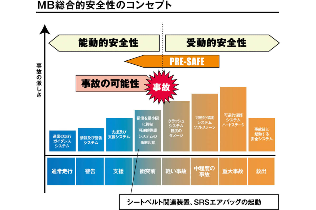 この事故調査活動とドライビングシミュレーターが生み出した成果として注目すべき安全性が、2002年秋に「Sクラス/W220」で実用化した「PRE-SAFE(プレセーフ)」である。つまり、メルセデス・ベンツは能動的安全性と受動的安全性の間にあるほんのわずかな「空白」に着目したのである。