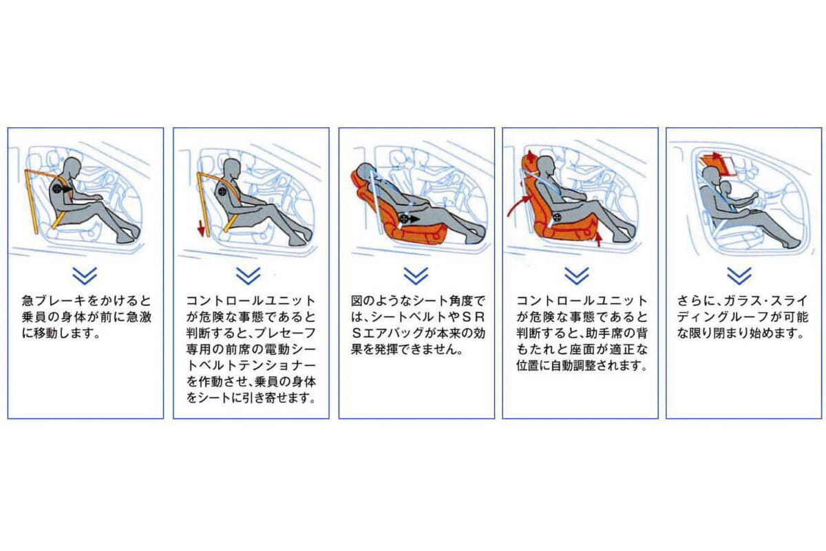 ドライバーが危険回避のための運転操作を行ってから実際に車両が衝突するまでに、「わずか数秒」の時間があること、またシートポジションなどが不適正な場合には、乗員の被害がより増大することを確認。この事実から、事故が起こる可能性を予測し、事前の早い段階で乗員保護の体制を整えようとする新しい安全コンセプト「プレセーフ」を世界に先駆けて開発、実用化した。能動的安全性と受動的安全性の虹の架け橋となるこの新しいプレセーフは、事故なき運転の実現を目指して取り組んでいる「総合的安全性」の成果のひとつでもある。