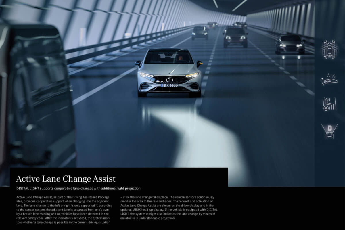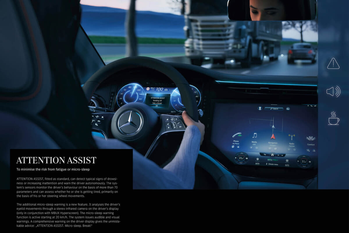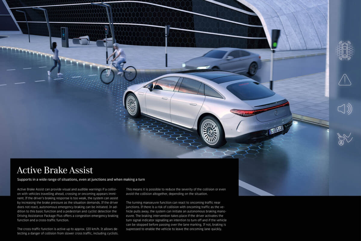 近年ではとくにメルセデス・ベンツ安全部門のエンジニアたちは、能動的安全性に重点を注いでいる。つまり、衝撃の激しさを和らげるだけでなく、そもそも衝突や事故を起こさないための安全革新技術に注力し開発を続けている。