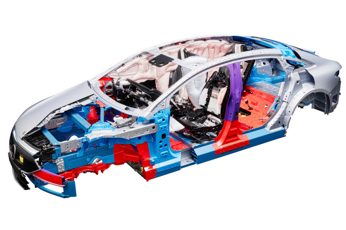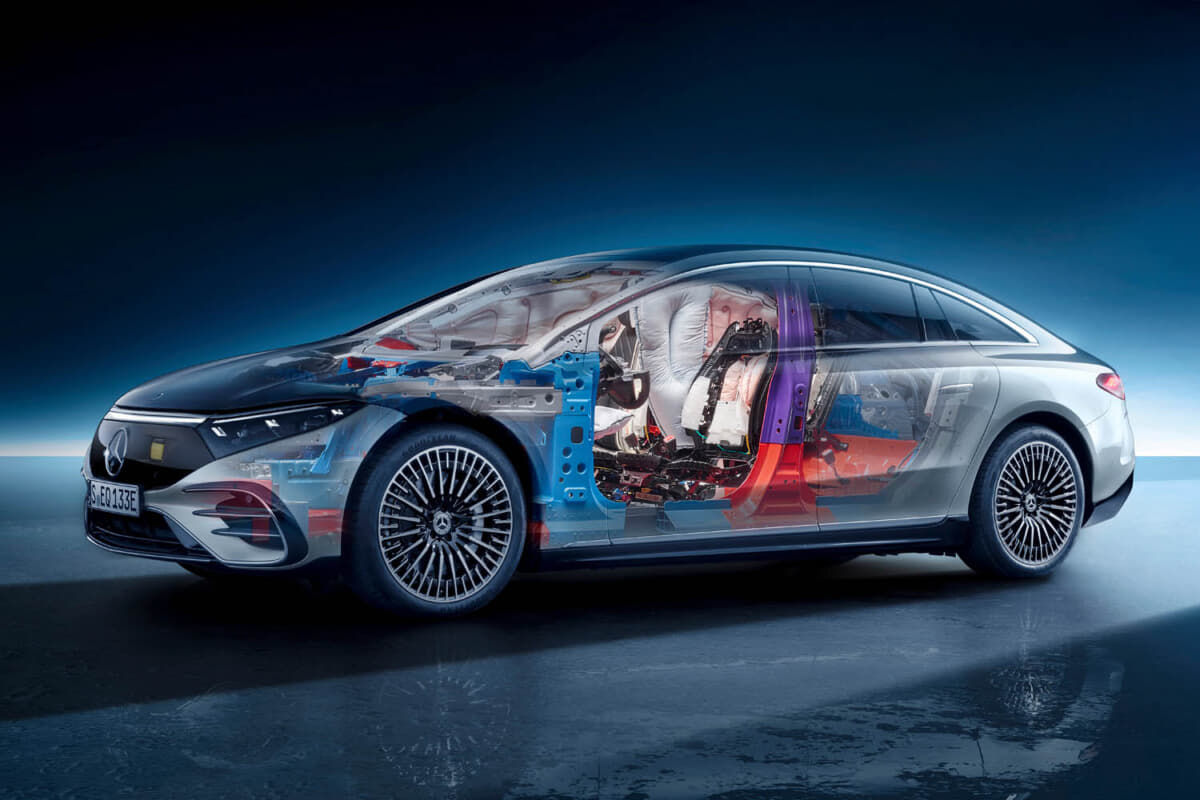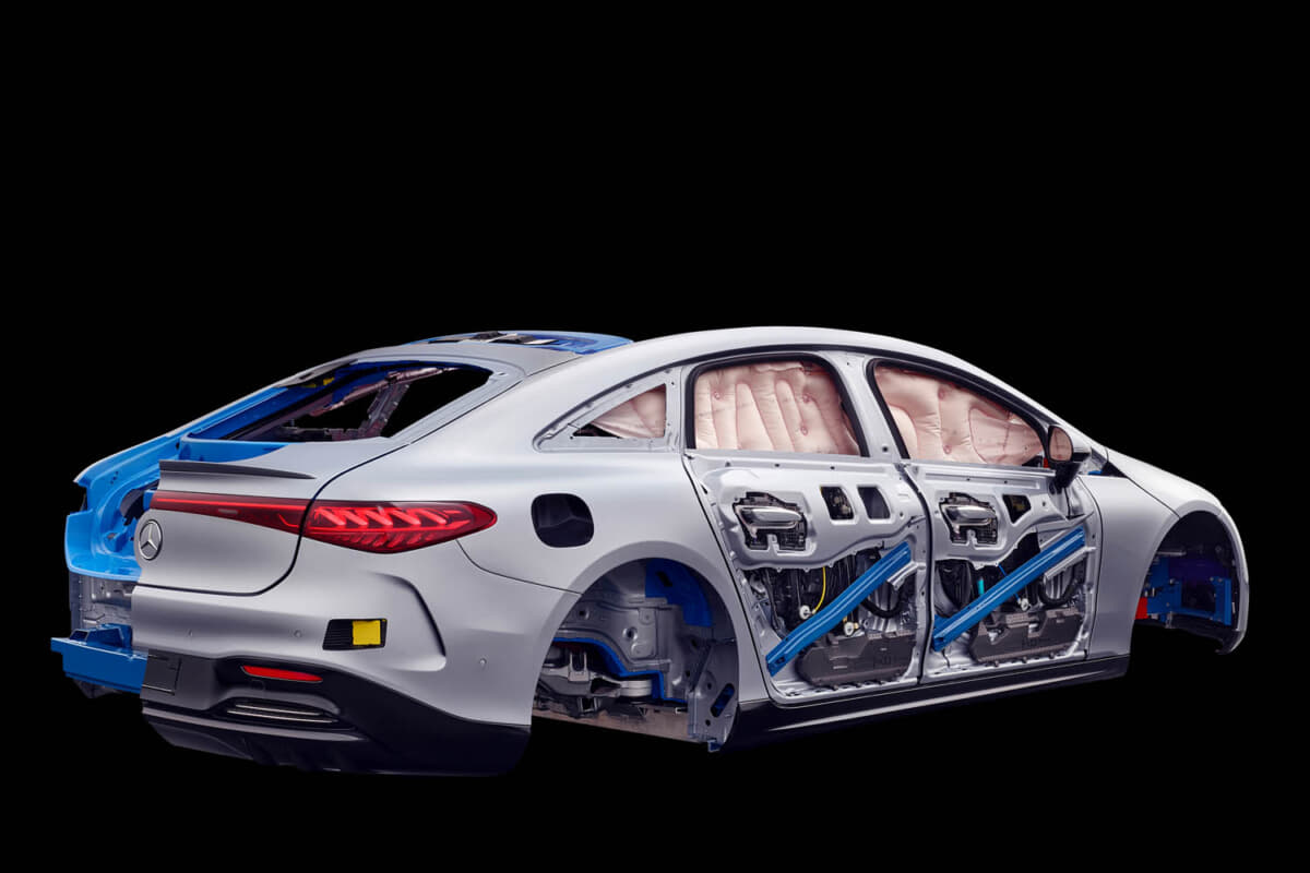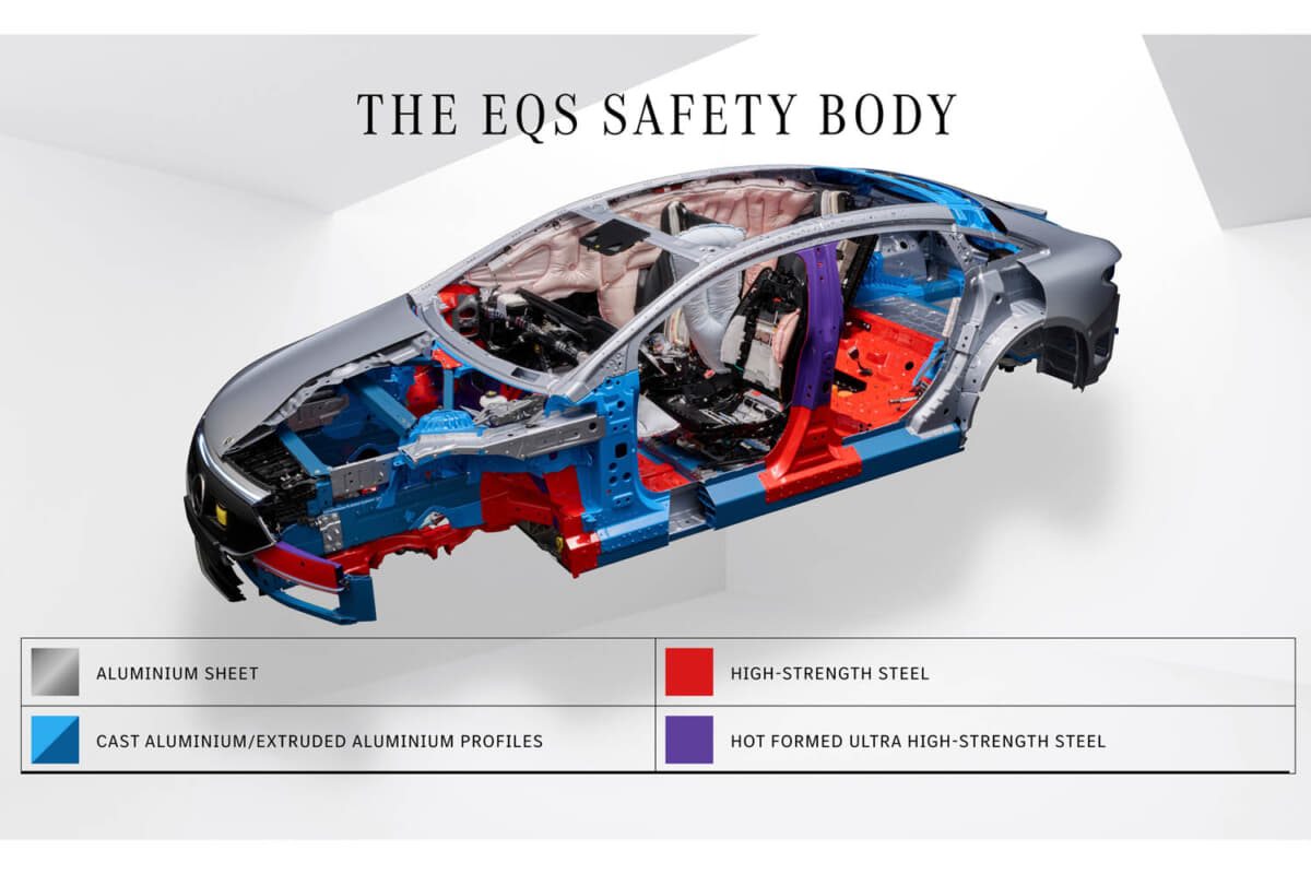 EQSのセーフティボディの材質構造は、アルミニウム、鋳造アルミニウム、高張力鋼、超張力鋼である。加えて、アルミニウムを多く含む素材をインテリジェントに組み合わせて、高強度の鋼から作られた補強材は、高い安全要件を達成するために使用されている。とくに、EQSのサイドドアのアルミニウムシートの下には、押し出しアルミニウムプロファイルがあり、側面衝突が発生した場合にボディ構造に力を分散させるようになっている。