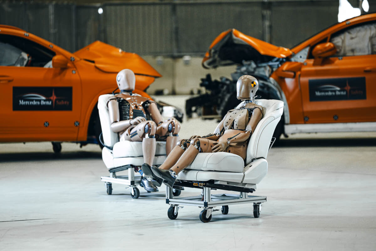 2023年の衝突テストでは、EQAとEQS SUVはそれぞれ2体の大人用ダミー(合計3人の女性と1人男性)を乗せてテスト。ダミーごとに最大150もある測定ポイントを分析すると、重傷から致命傷のリスクが低いことが分かった。これはクラッシャブルゾーンと高度な拘束システムが、深刻度の高い衝突時に非常に優れた乗員保護をしていることを意味している。つまり、高電圧システムの自動シャットダウン、エアバッグやベルトフォースリミッター付きベルトテンショナーなど、全ての安全装置が機能したということである。