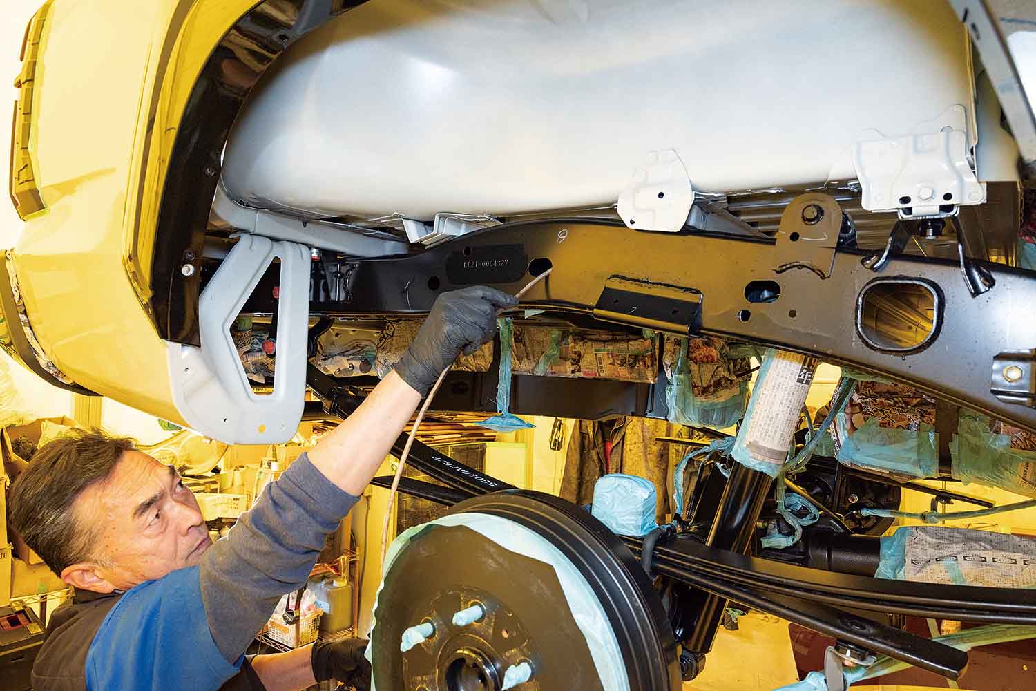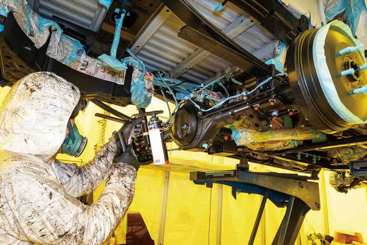 また洗浄では溶剤の濃度をどうするか、どの工程だとベストな仕上がりに繋がるかなど、これまで得た豊富なノウハウにより作業が進められる。また東北という地域柄、塩害による防錆対策も行っている。ブレーキやサスペンションなどをきちんと養生して塗布される。フレームの内側もコーティングして、徹底的に防錆対策を施す。