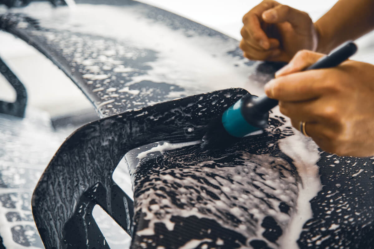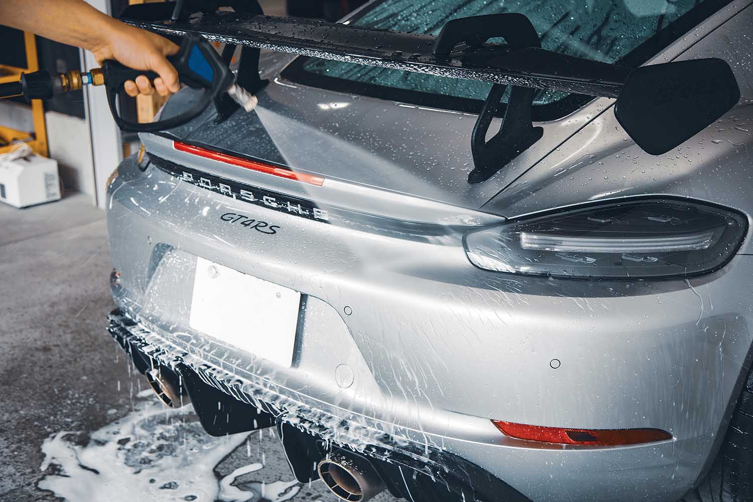 コーティングは下地が命。雨染みやスケールのほか花粉などを1日かけてしっかりと洗浄し、ディテイリングブラシで細部の汚れも除去してから施工される。スポーツカーはさまざまな素材のパーツを使用しているため、磨きには細心の注意が必要だ。熟知している同社だからこそ安心して依頼できる。