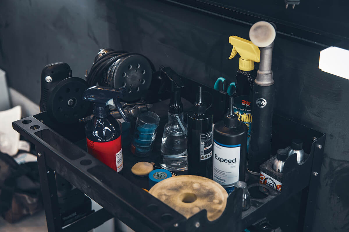 “磨き屋”をはじめてから約5年。さまざまなコーティング剤を使い、日々研究を重ねた結果、現在同社で扱うコーティングはセラミックがメインとなっている。ガラスコーティングとは圧倒的に艶感が違うのも魅力のひとつだ。取り扱うコーティング剤は、ファインラボとアダムスの2社だが、とくにおすすめなのはファインラボの“自己修復タイプ”とのこと。