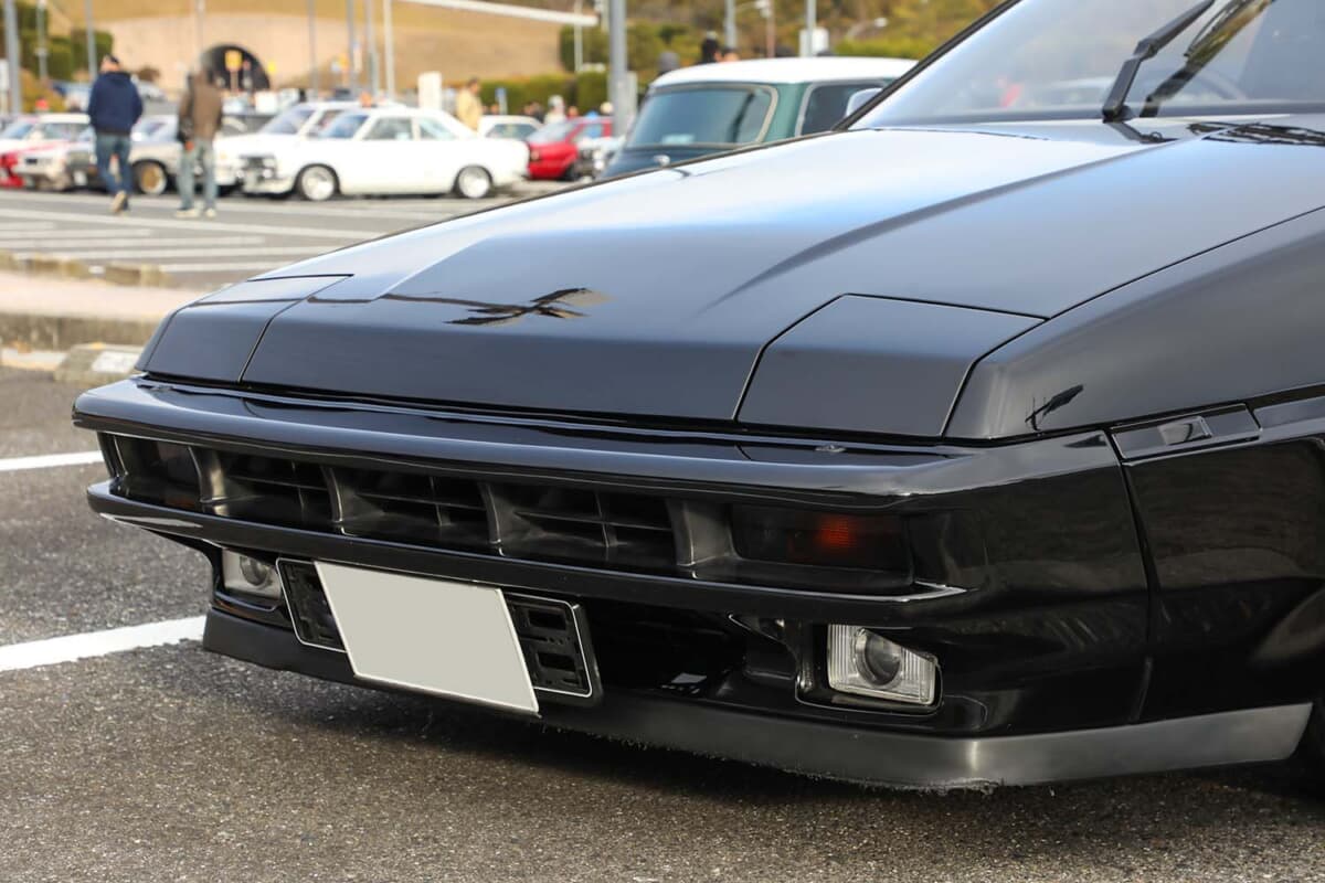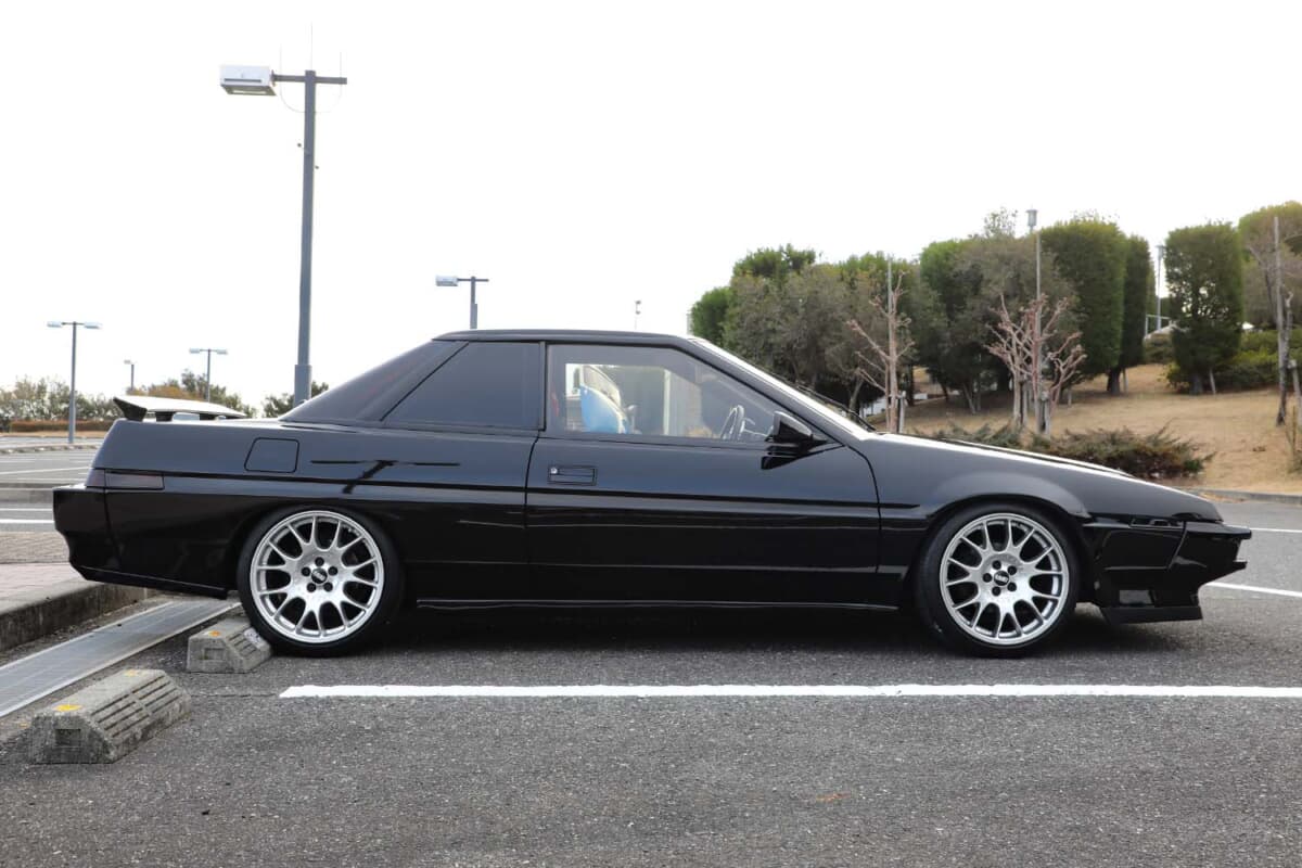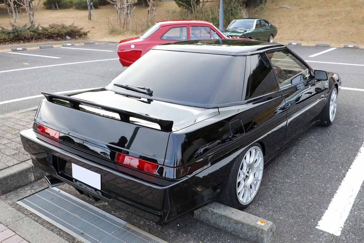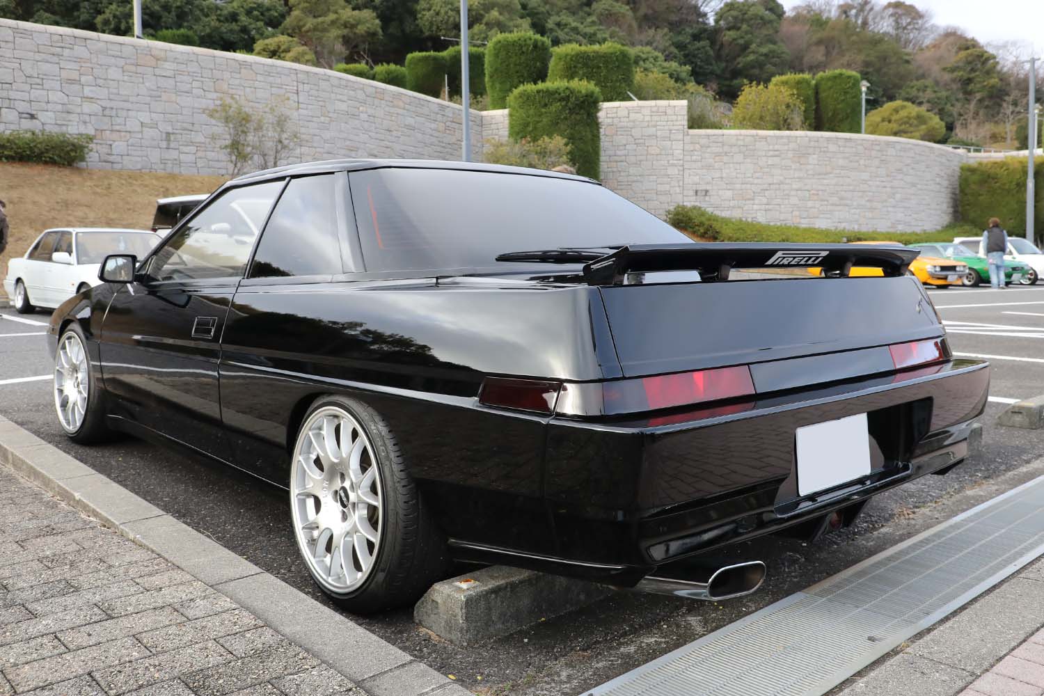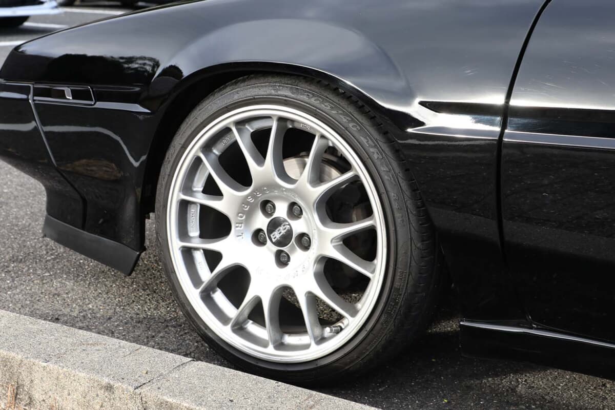 ここで紹介するブラックのアルシオーネは、おそらく多くの人が気づかないであろうマニアックな1台だ。フロントバンパーは2.7Lモデル用、リアバンパーは1.8Lモデル用を装着している。ベース車は2.7Lモデルとのことで、フロントまわりは純正状態を良好に保っている。ただ、以前のオーナーがカスタム好きだったようで、サスペンションは車高調キットに交換され、ホイールはBBS製を装着。タイヤとフェンダーとのクリアランスをなくすため、スペーサーで外側にオフセットし、ロングスタッドボルトへの打ち直しも行われている。
