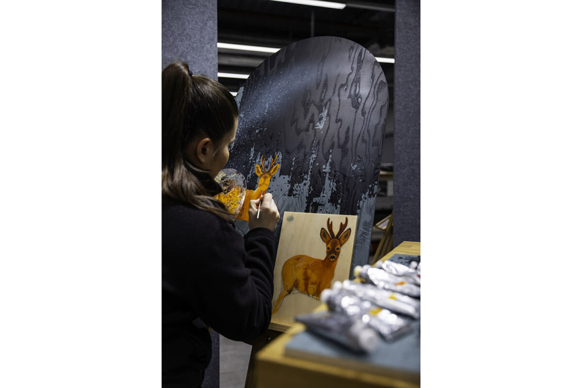 この魅惑的な森の情景は、インテリア、エクステリア、インテリアの各トリムセンターの職人たちによる共同制作であり、昼・夕方・夜という3つの時間帯における自然の美を3連作(トリプティク)。各情景にはカワセミが描かれ、その時間の移ろいに応じた技法で、その特性を巧みに表現している。