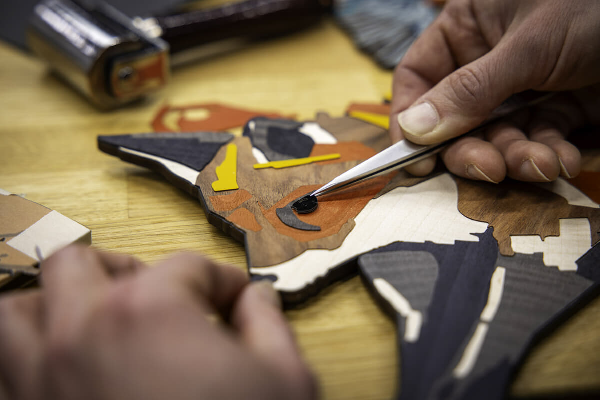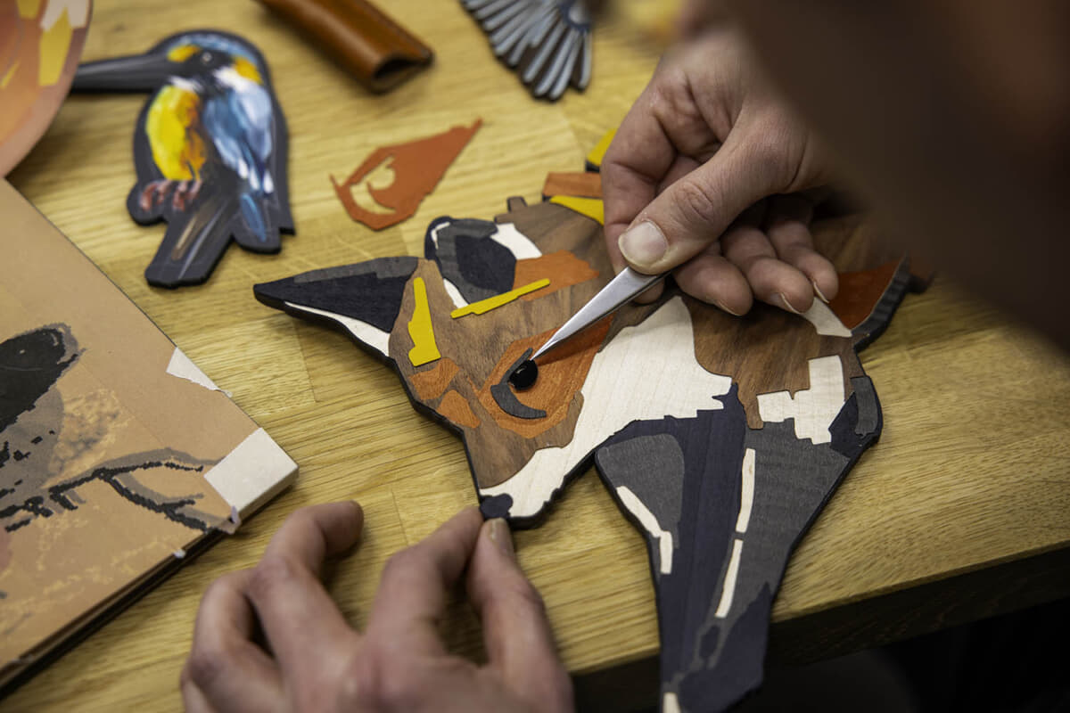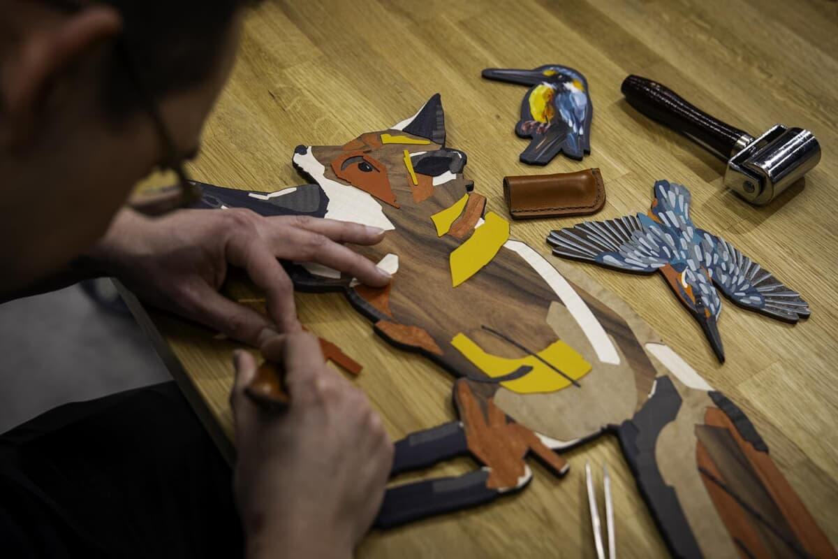 • キツネが静かに森へ足を踏み入れる様子が、精緻な寄木細工で表現されている
