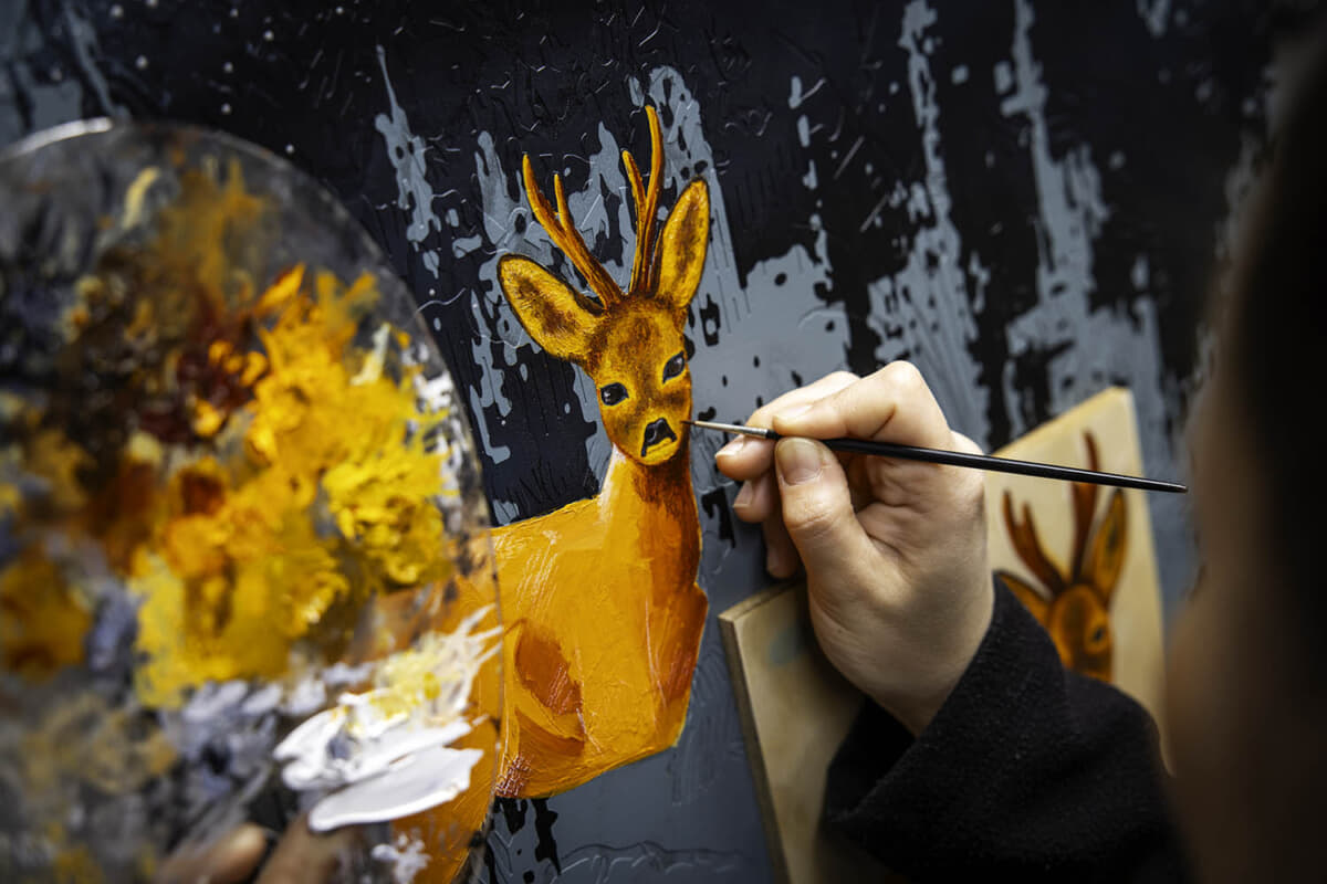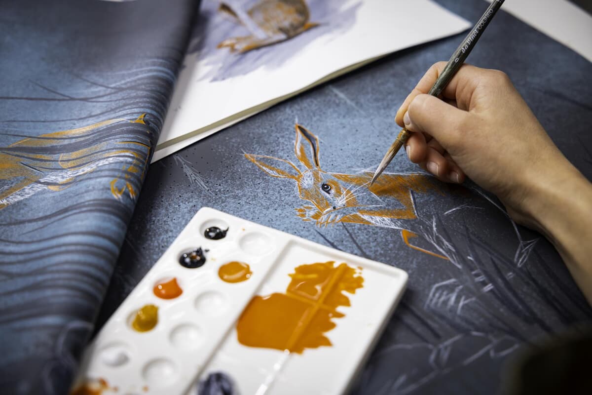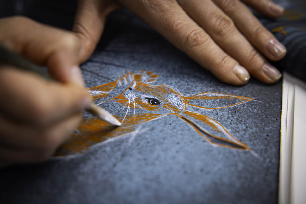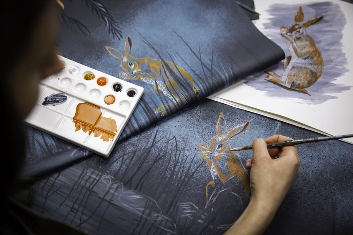 • 長い耳と強靭な後脚の優美な野ウサギ、美しい尾を持つリスなどが、レザーに手描きされている
