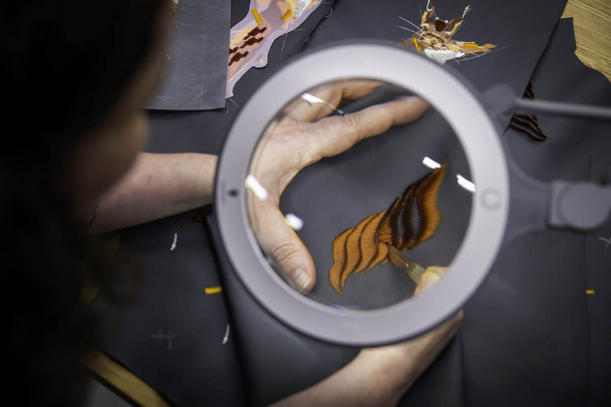 • 複雑な立体刺繍技法やリスの尾の質感とボリューム感を再現するための「タフティング」という技法を採用