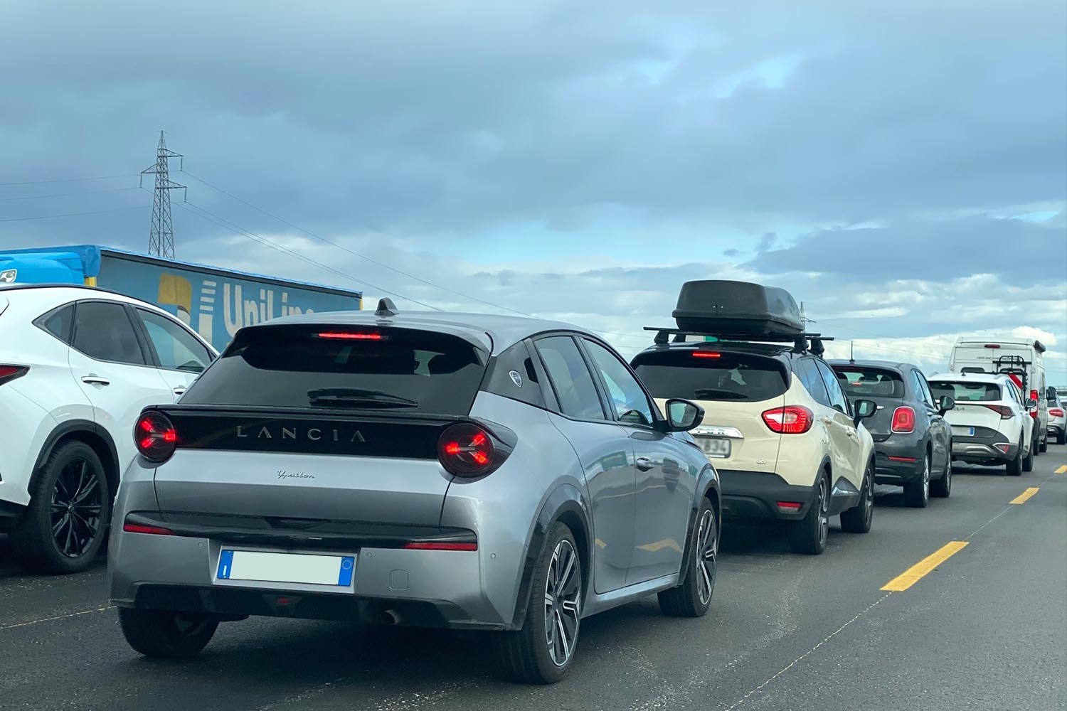 渋滞の中でストップ・アンド・ゴーを繰り返しているとき、ふとぼんやりとサイドミラーを見たら、「なんだこれは?」というクルマを発見。なんと、新しいEVのランチア「イプシロン」ではありませんか。ドイツではまだ一度も見かけたことがなかったので、驚きました。ランチアには、素敵なイタリア美人のおふたりが乗っておられました。