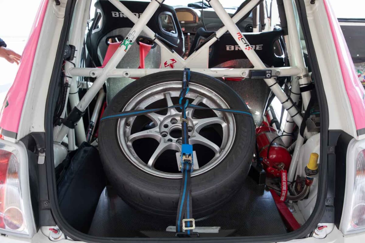 • アバルト500 R3T:リアゲートを開けるとロールケージが張り巡らされ、スペアタイヤが収まる