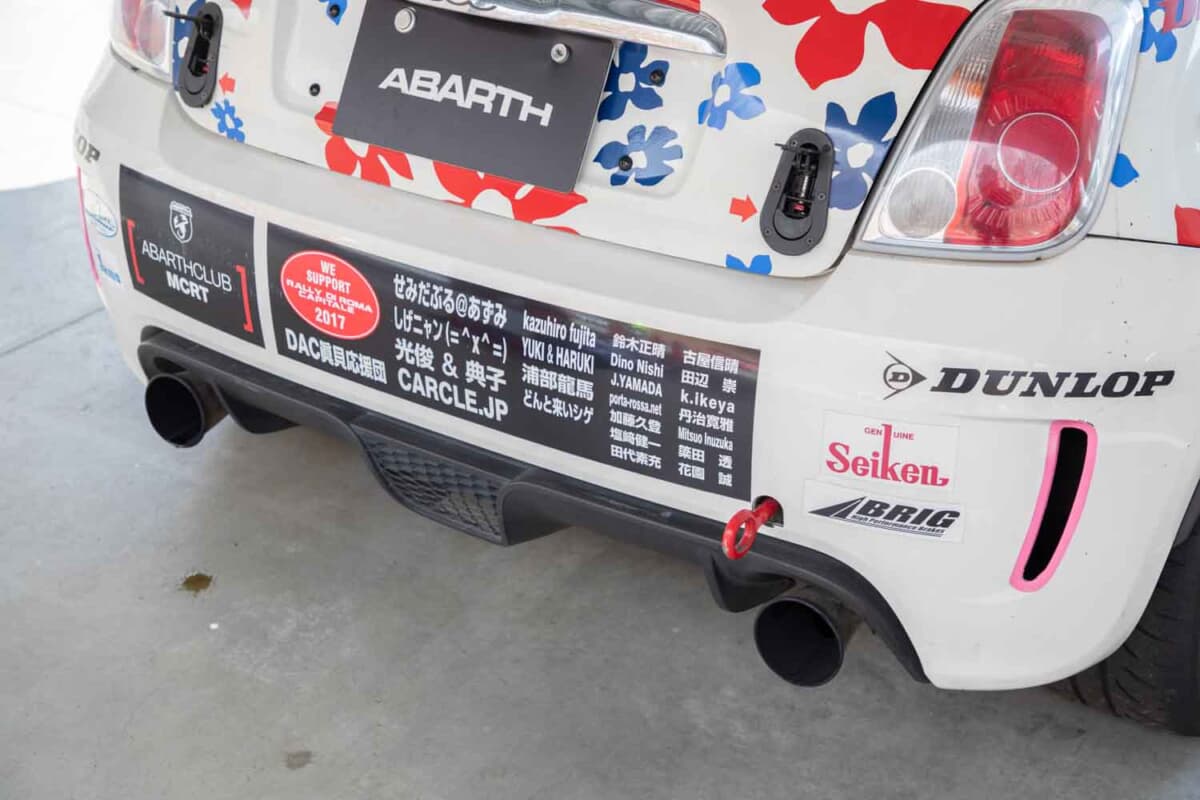 • アバルト500 R3T:リアバンパーにはDAC眞貝応援団のステッカーも