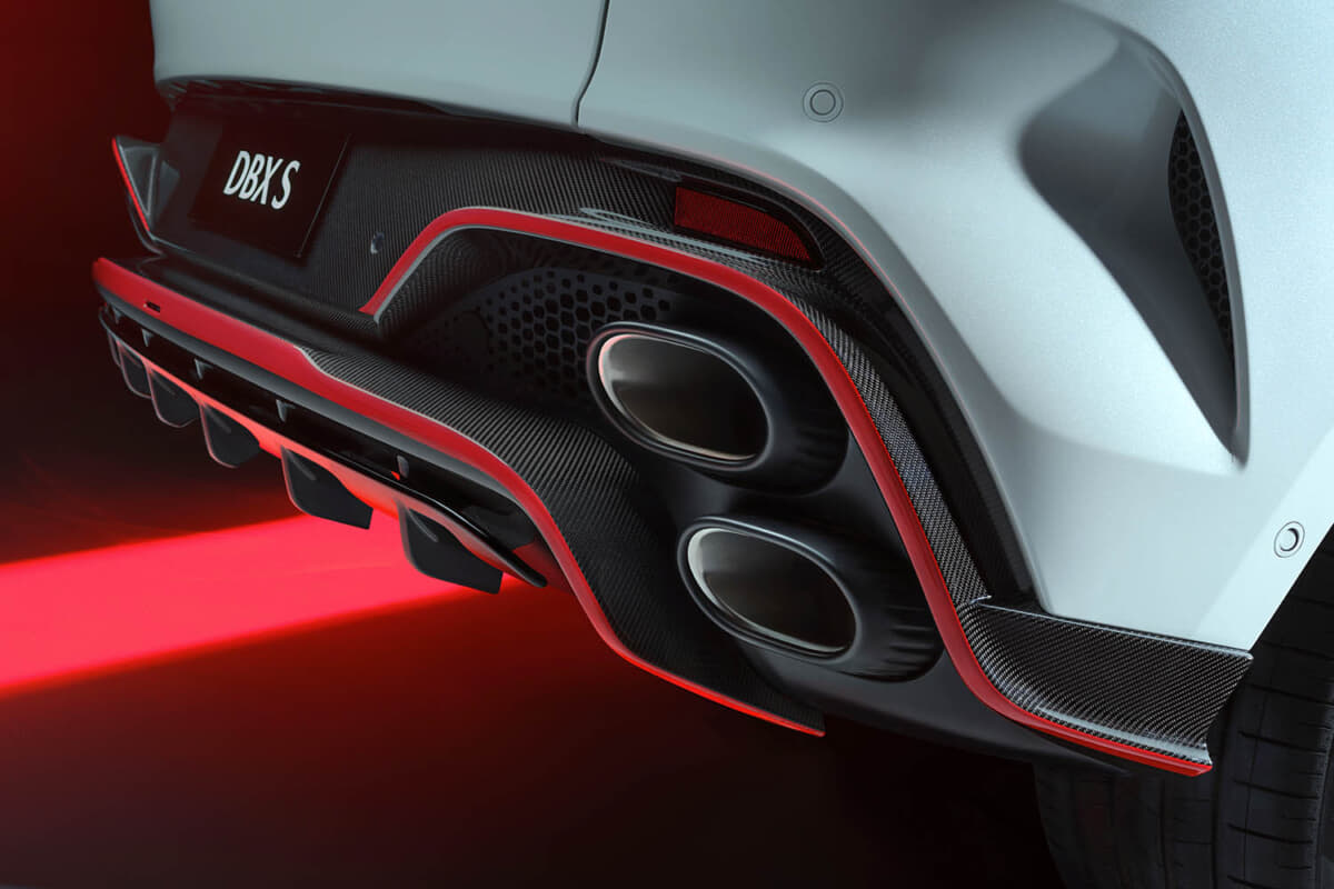 • アストンマーティン DBX S:リアバンパーおよびディフューザーは再設計されており、サイドシルやリアウイングとあわせてカーボン仕様を選択することで、さらに7kgの軽量化が可能
