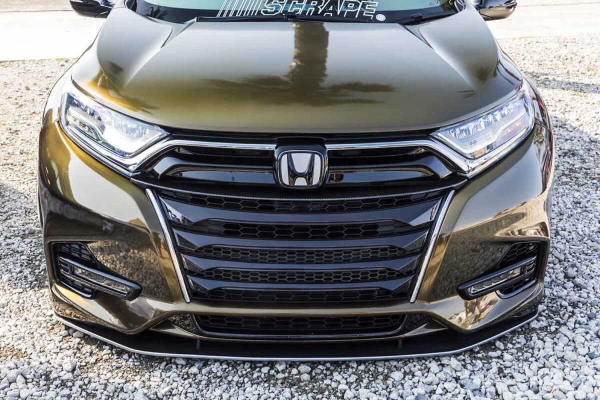 「フロントバンパーは上半分が純正で、下半分はホンダ オデッセイ用をドッキングしてます。接合部分ができるだけ自然に見えるようにカットラインを考え合体させました。ラジエータグリルは上半分がCR-Vの北米仕様で、下半分はオデッセイ用をドッキングしています。いずれもデザイン的に違和感がないように気を使ってます」