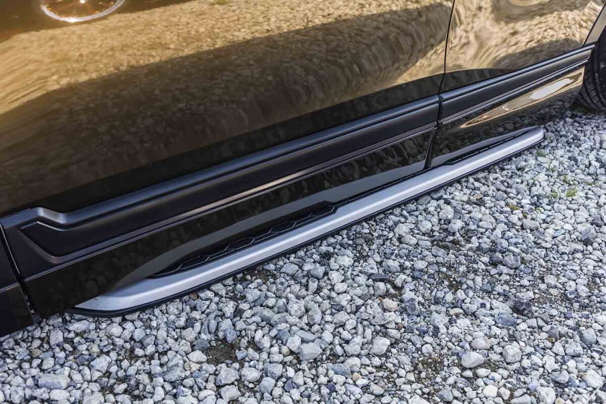 ほかにもフロントまわりには工夫が詰まっている。純正フェンダーに備わる黒い樹脂のモールがバンパーの上半分で終わってしまうため、バンパー下部分までモールを追加して延長。さらにバンパー下にはDIYで製作したフロントリップを装着しているが、サイドステップとの高さを合わせることで、後述するエアサスで全下げした際、純正オプションのサイドステップとフロントリップが同時に接地する仕組みだ。
